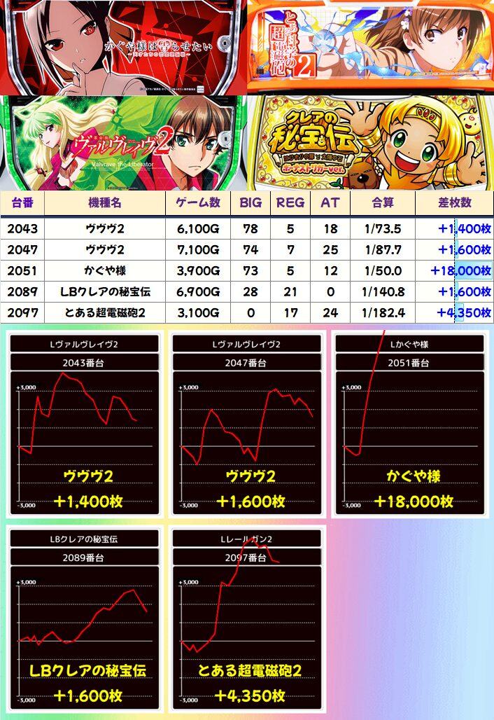 かぐや様からコンプリートが出ました!それも朝イチからの一撃で一気に突き抜けていく展開です。対してクレアの秘宝伝は中盤から終盤までが安定して伸ばし続けてます。