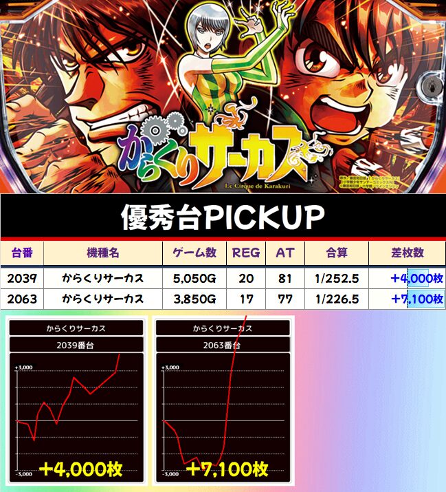 サンちゃんポストの示唆と思われる台。なんと万枚が2台も飛び出してます。上位ATの破壊力を思う存分発揮してますね!