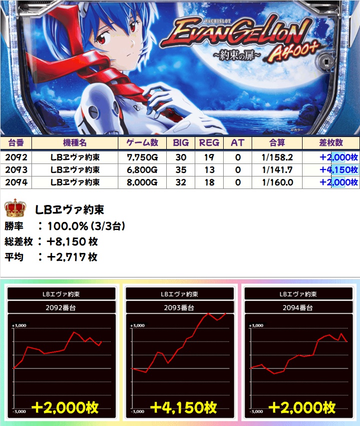 機種別でナンバーワンの平均+2717枚を叩き出したのが「エヴァ約束」!