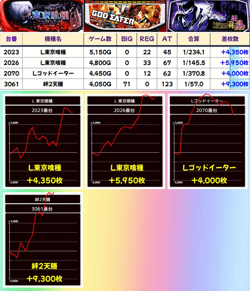 上記仕掛け以外にも、この日のナンバーワン差枚+9300枚を記録した「絆2天膳」、大人気機種「東京喰種」の+4000枚以上×複数など優秀な単品をまだまだ確認できました!