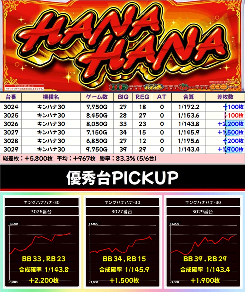 1/2系:キンハナ30(5/6台+)➡平均+967枚