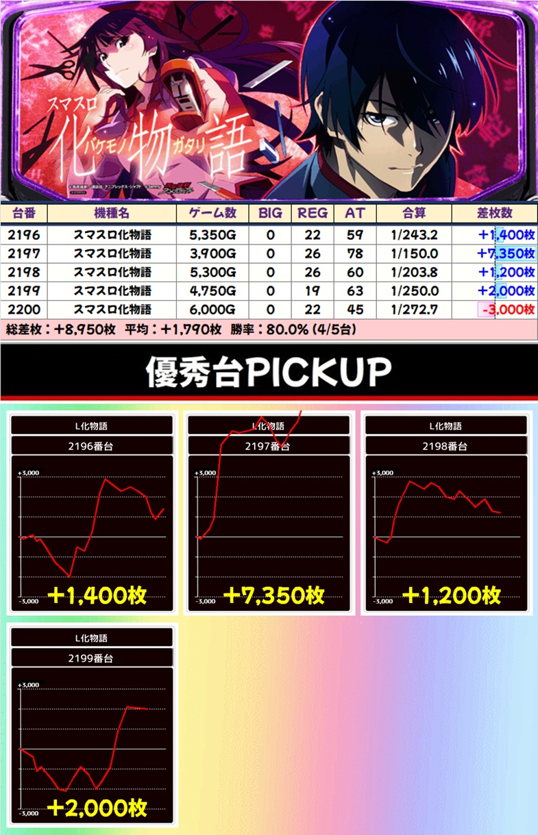 「からくりサーカス」&「モンキーV」&「化物語」には+5000枚以上のモンスター台、「鉄拳6」は半数の台が+3000枚クラスとしっかり結果を残していました!