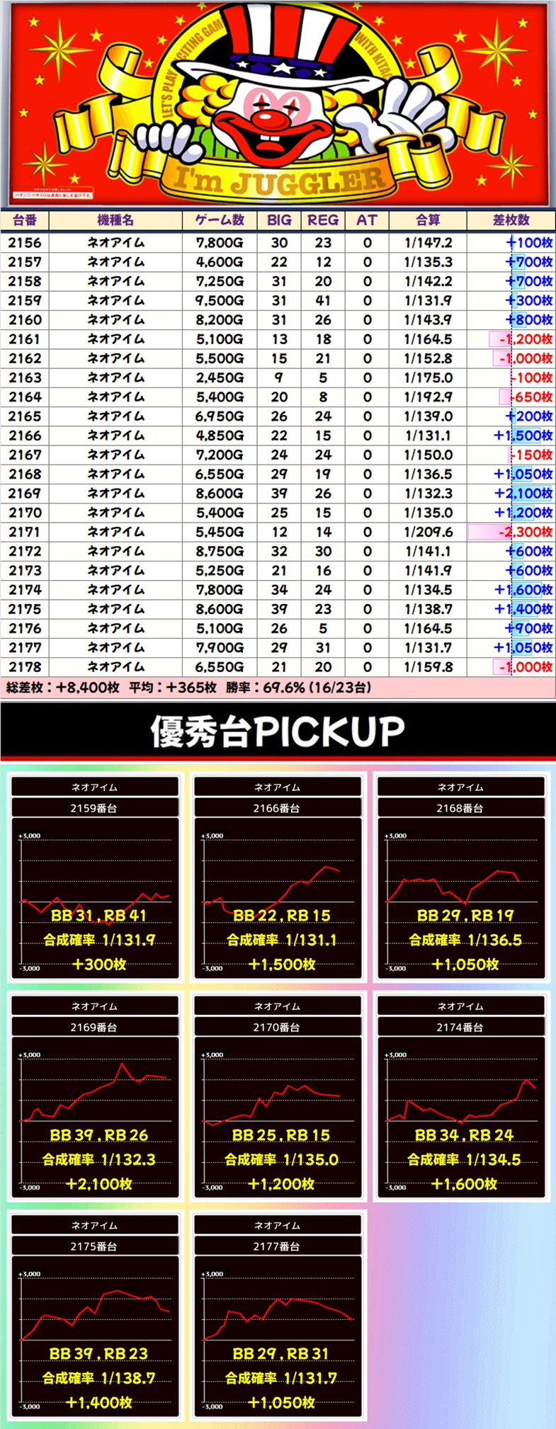 1/2系:ネオアイム(16/23台+)➡平均+365枚