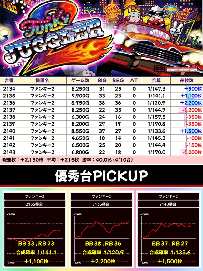 1/2系:ファンキー2(4/10台+)➡平均+215枚
