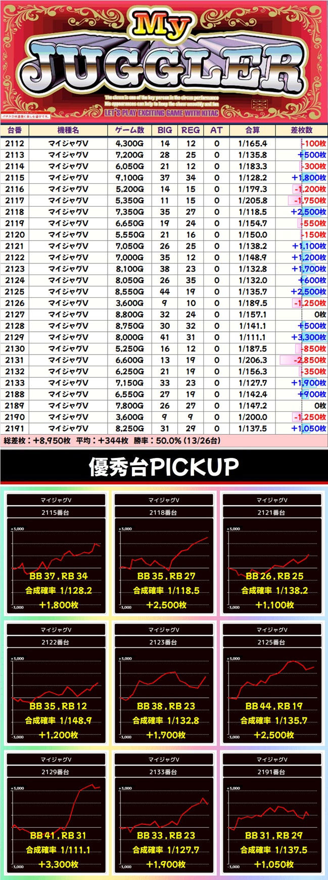 1/2系:マイジャグV(13/26台+)➡平均+344枚