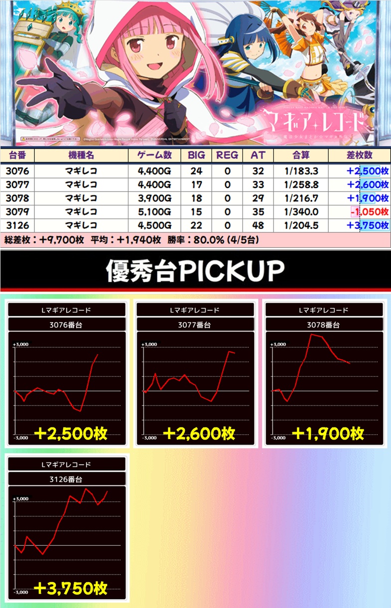 各機種に+2000枚以上の優秀台がありましたが、中でも「マギレコ」は+3750枚を筆頭に5台中4台が大幅プラスで平均+2000枚と圧巻でした!