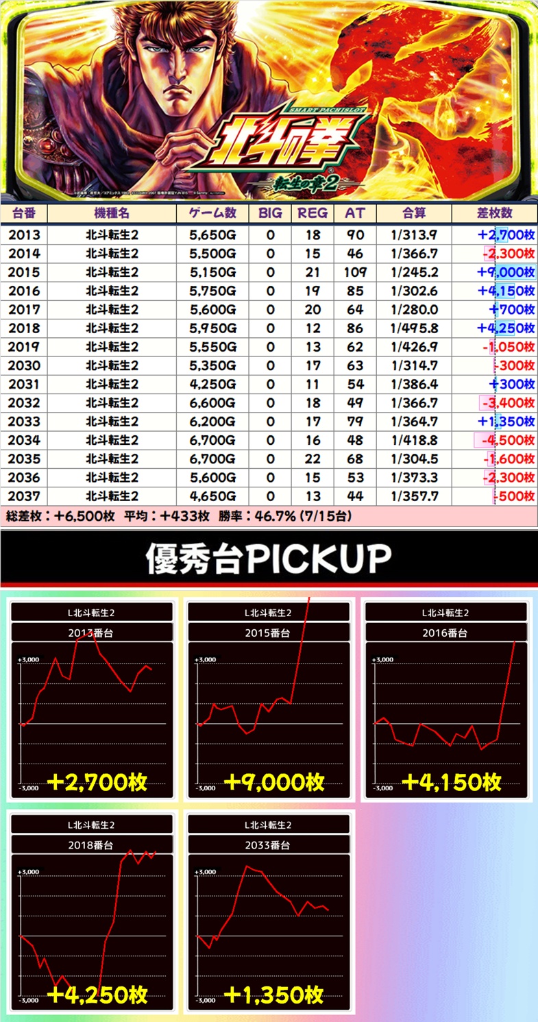 高配分:北斗転生2(7/15台+)➡平均+433枚