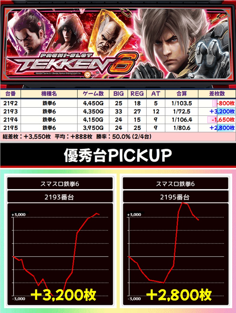 1/2系:鉄拳6(2/4台+)➡平均+888枚