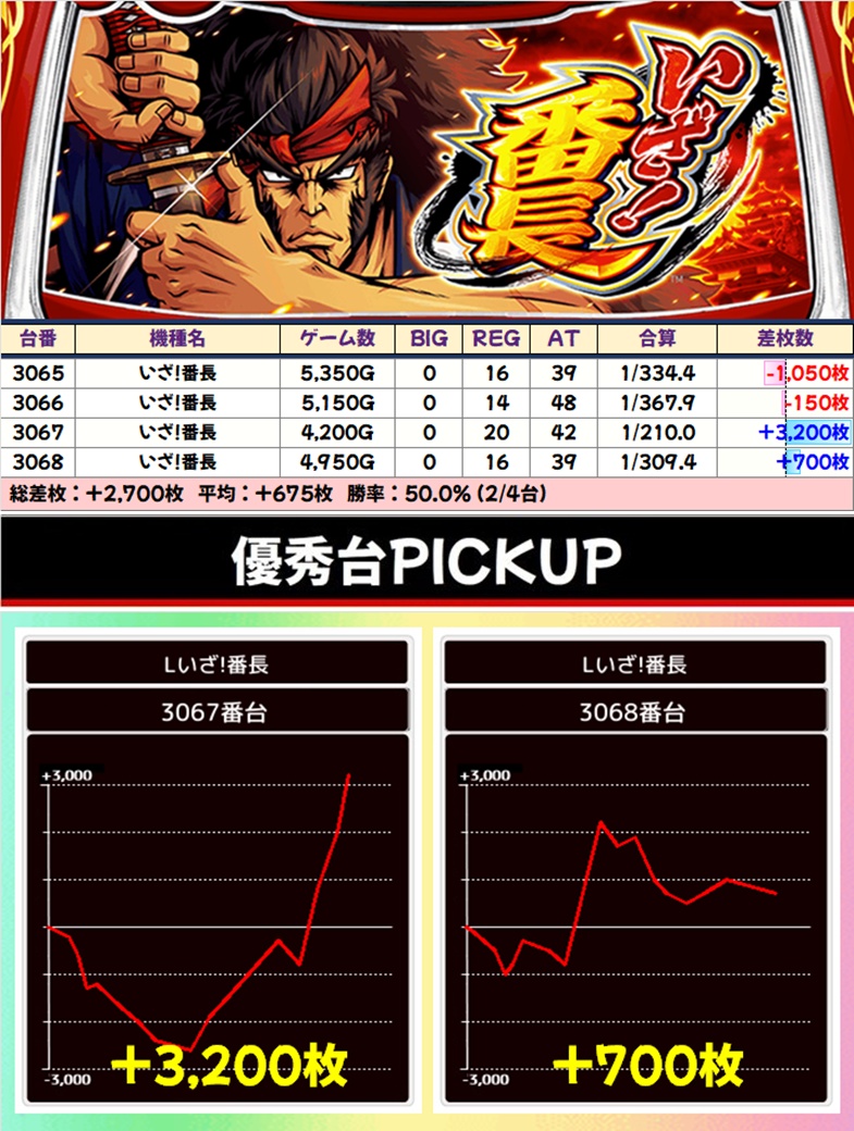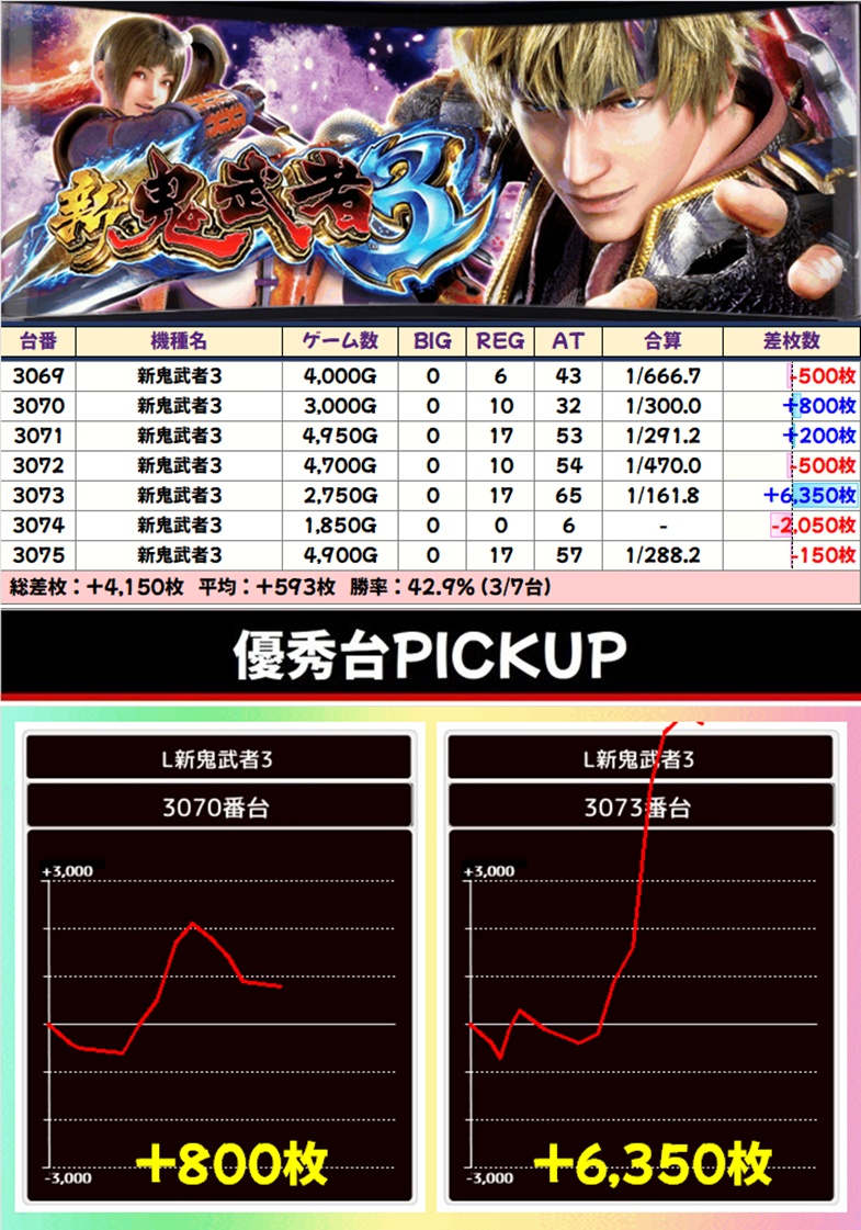 「新鬼武者3」には+6000枚以上、「いざ!番長」には+3000枚以上と抜群の台を確認!