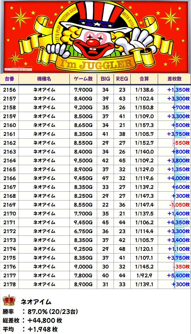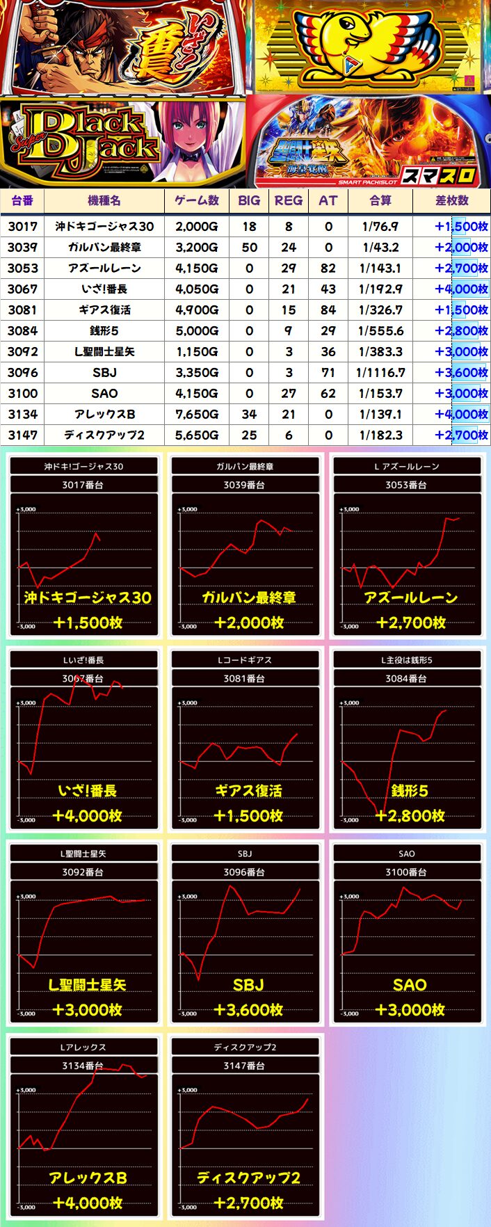 ジャグは上記の通り、一週間で全台系と思われる機種がみてとれます。最後の日曜日はまだ未投入だったミスジャグとガールズは高配分仕様と思われる結果が出ました。全台系はおそらくネオアイムか?