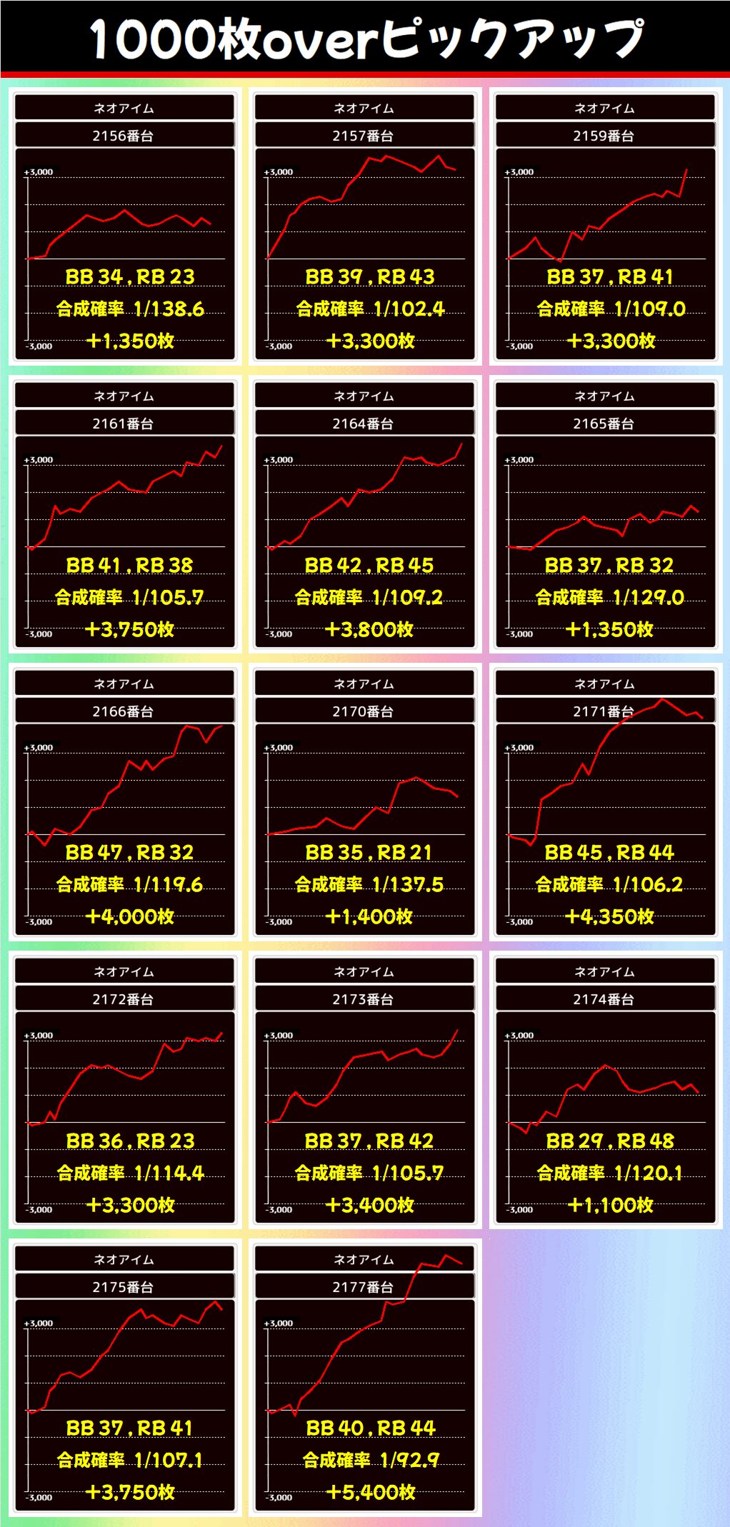 全台のグラフは多すぎると思うので、1000枚をこえた台を下記に並べます。それでも14台ありますが…。