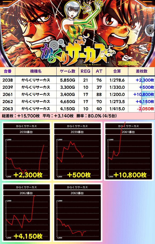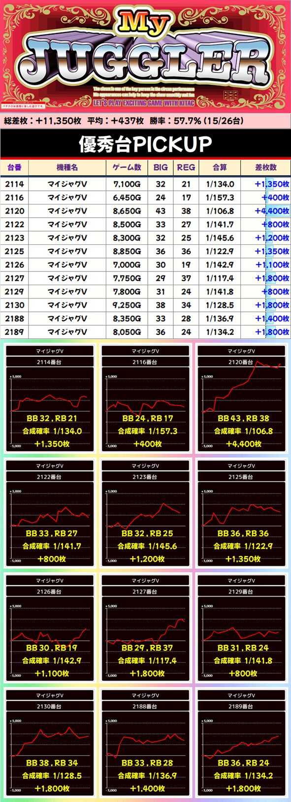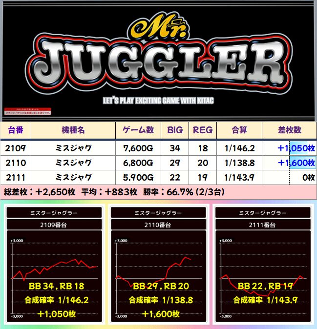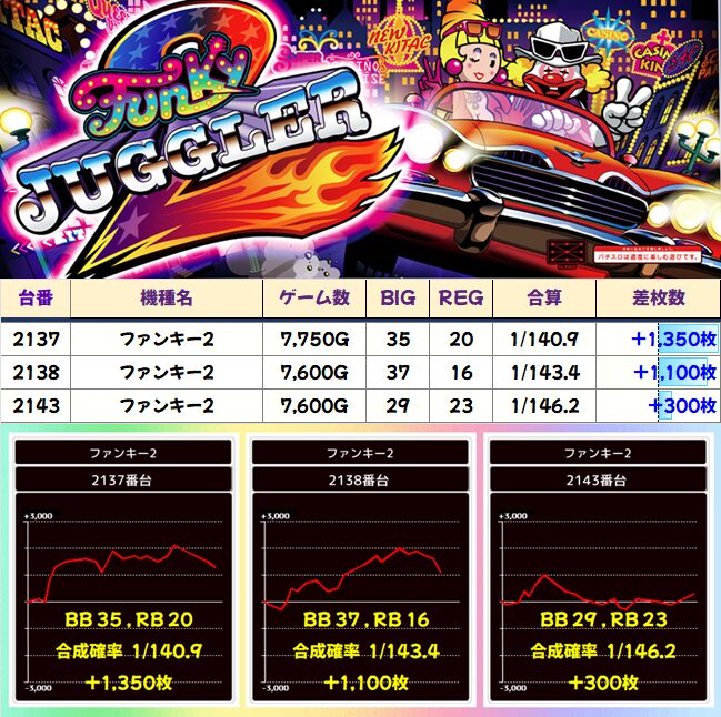 相変わらず強い日曜日!今回はこの出玉の立役者となったのは、やはり「ジャグラー」でした。高配分投入機種が多く、後程ジャグだけでまとめた結果をみても、一目瞭然だと思います。