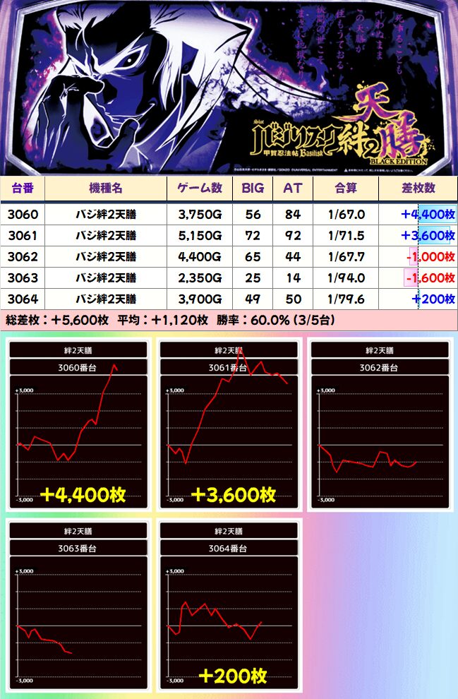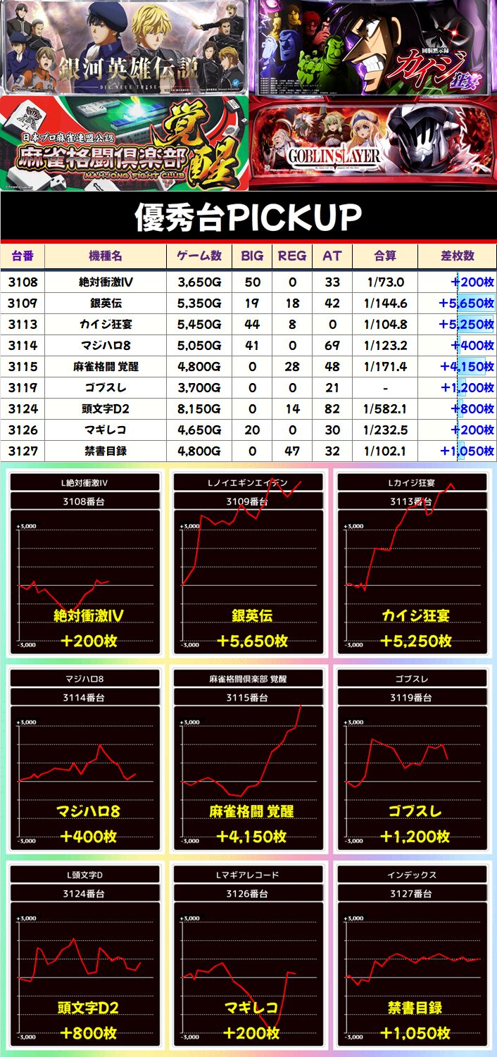 宿怨ループに頼らずにしっかり出玉を獲得した台が2台。渋谷本館では天膳がいまだ現役でいるのもよくわかる配分かと。