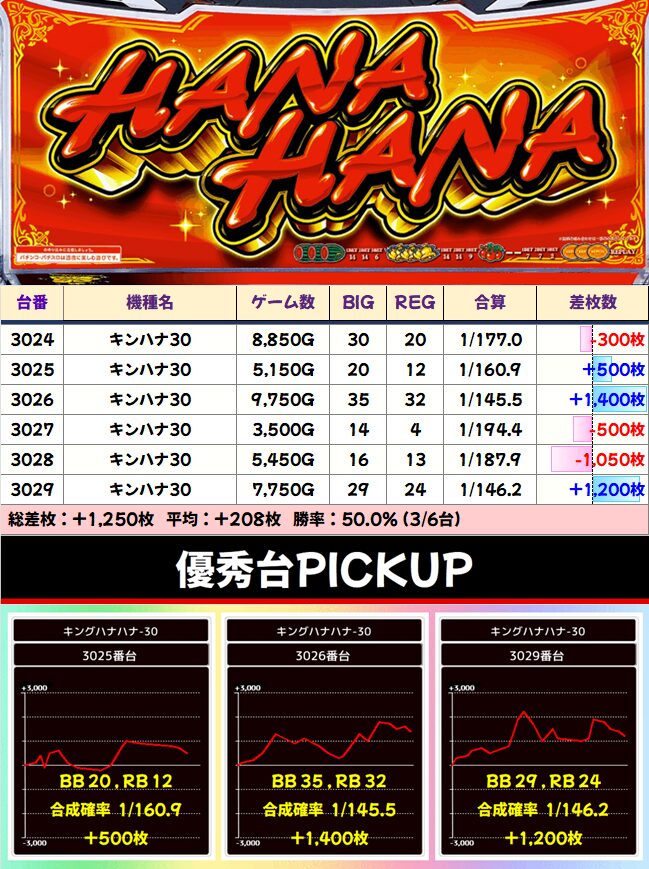 オススメ機種の一つ。1/2系とはいかずとも、初当りが優秀な台が2つあるのがわかりますよね。