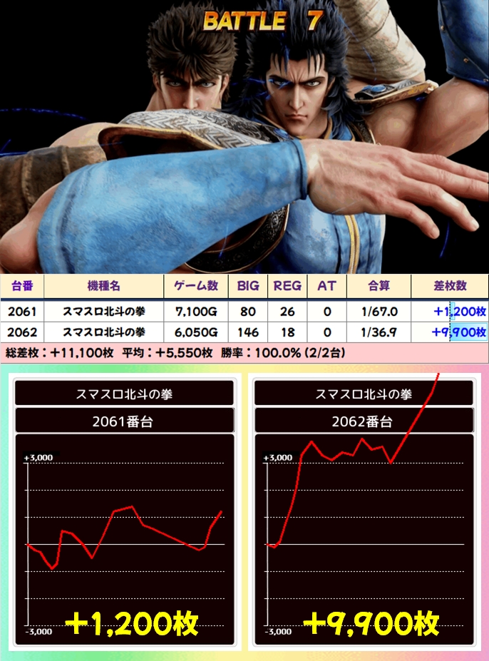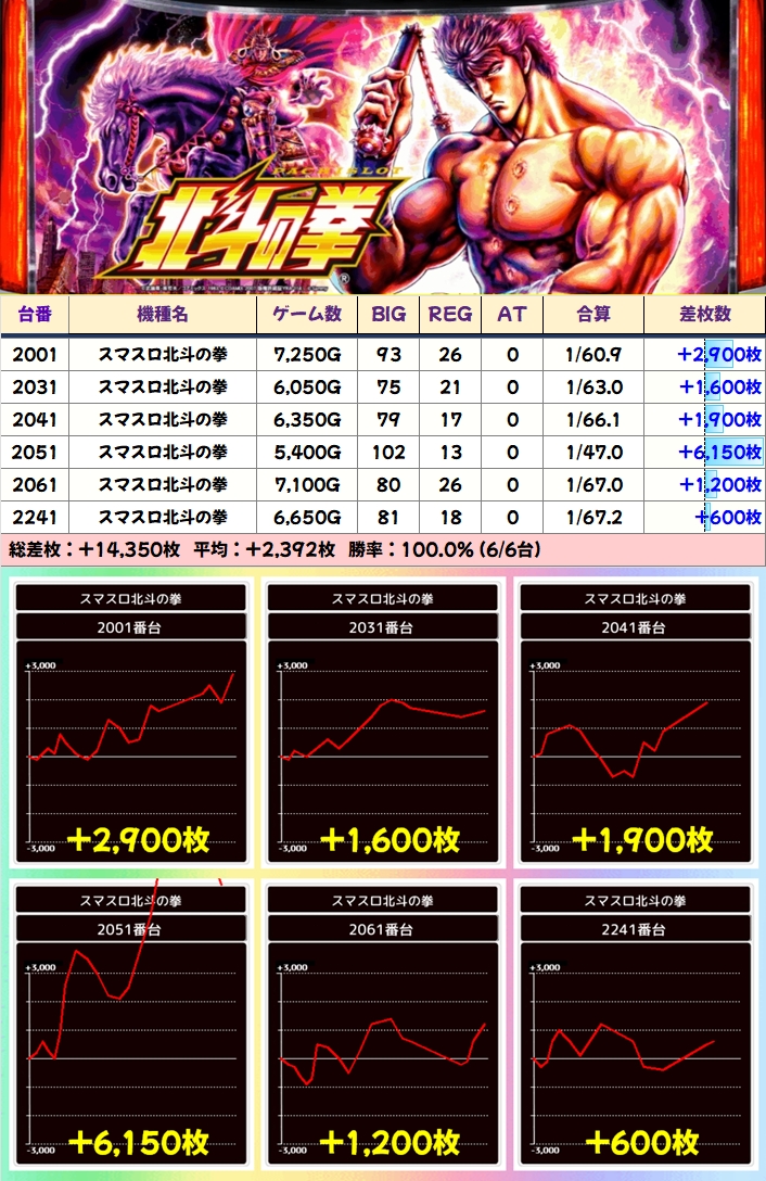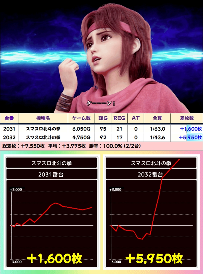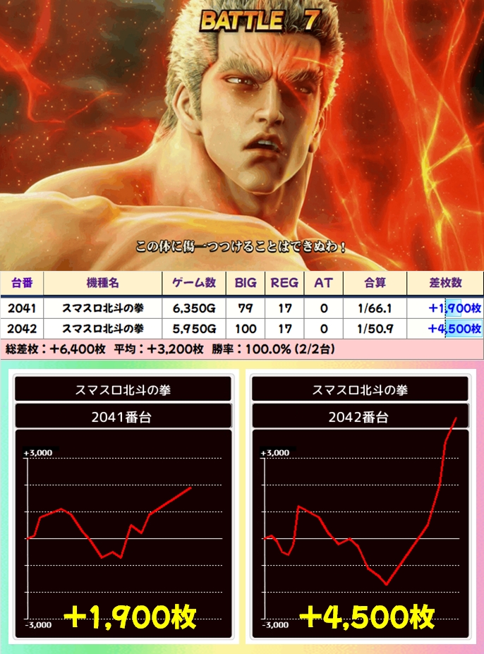 なお、今回の北斗は約半数の台がプラス差枚を記録しており、平均+360枚としっかりプラス差枚となっていました!