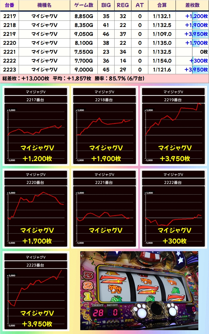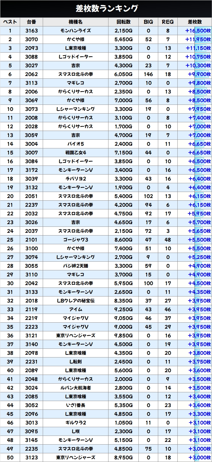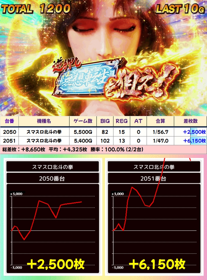 総差枚+10万枚と大幅プラスを記録! やはり超ド級告知は期待できますね。