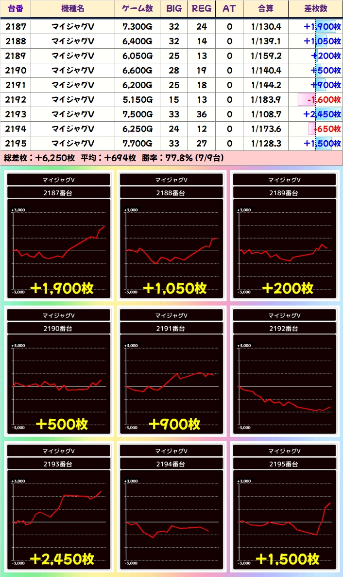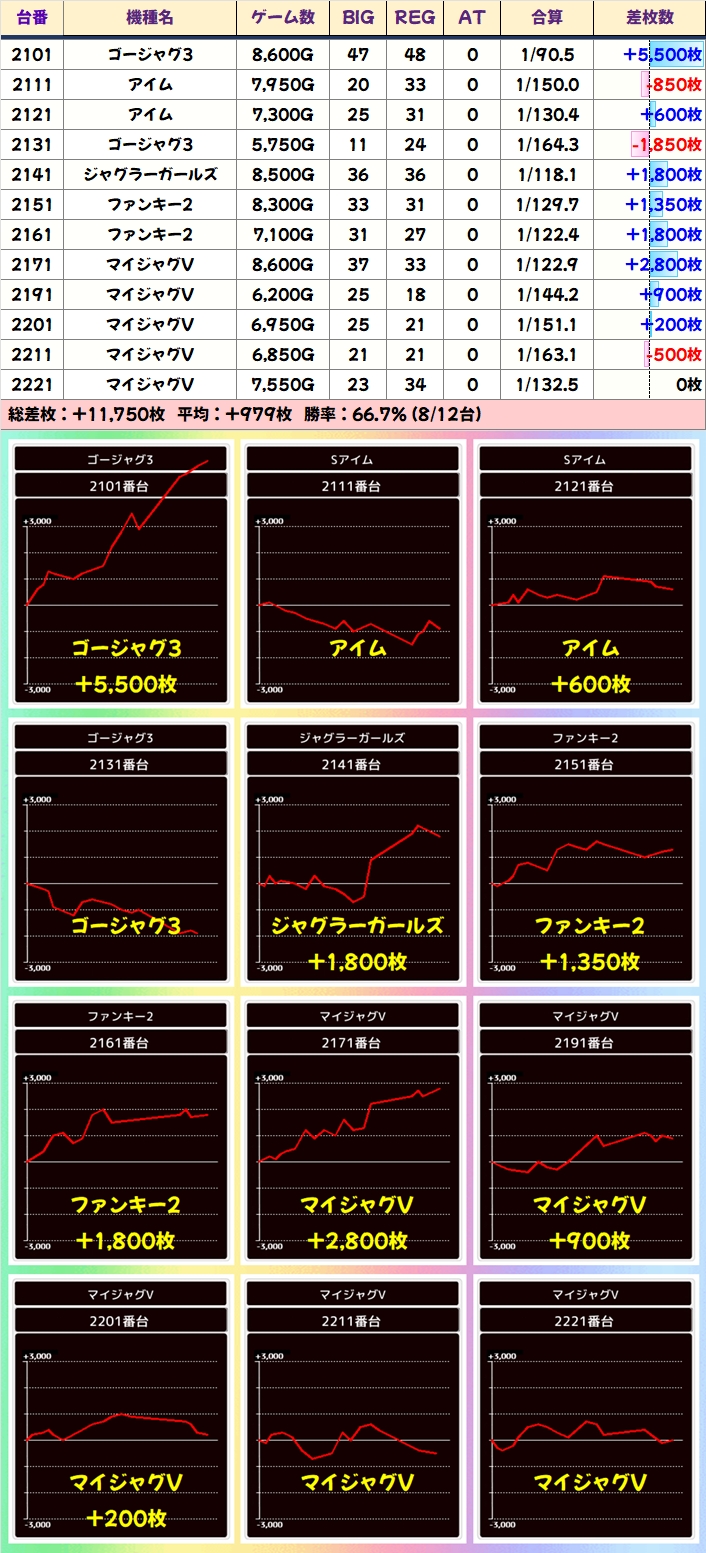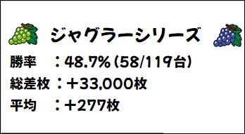 また、今回はジャグラー全体が高配分になっており、ジャグラーシリーズ全体で大幅プラスを記録していました。