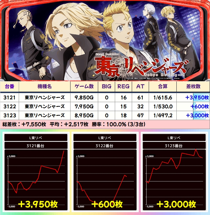 この日は週間オススメポスター機種のジャグラーと北斗から並びを確認できましたが、準新台の「東京リベンジャーズ」からも3台並びを確認!