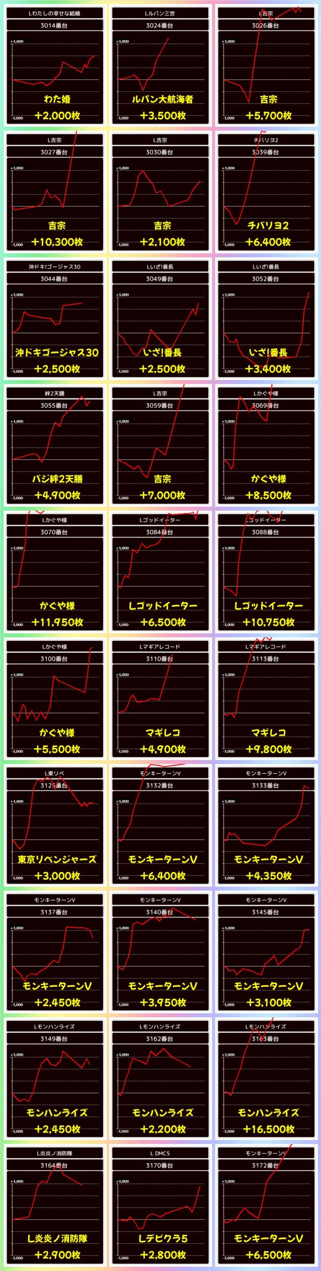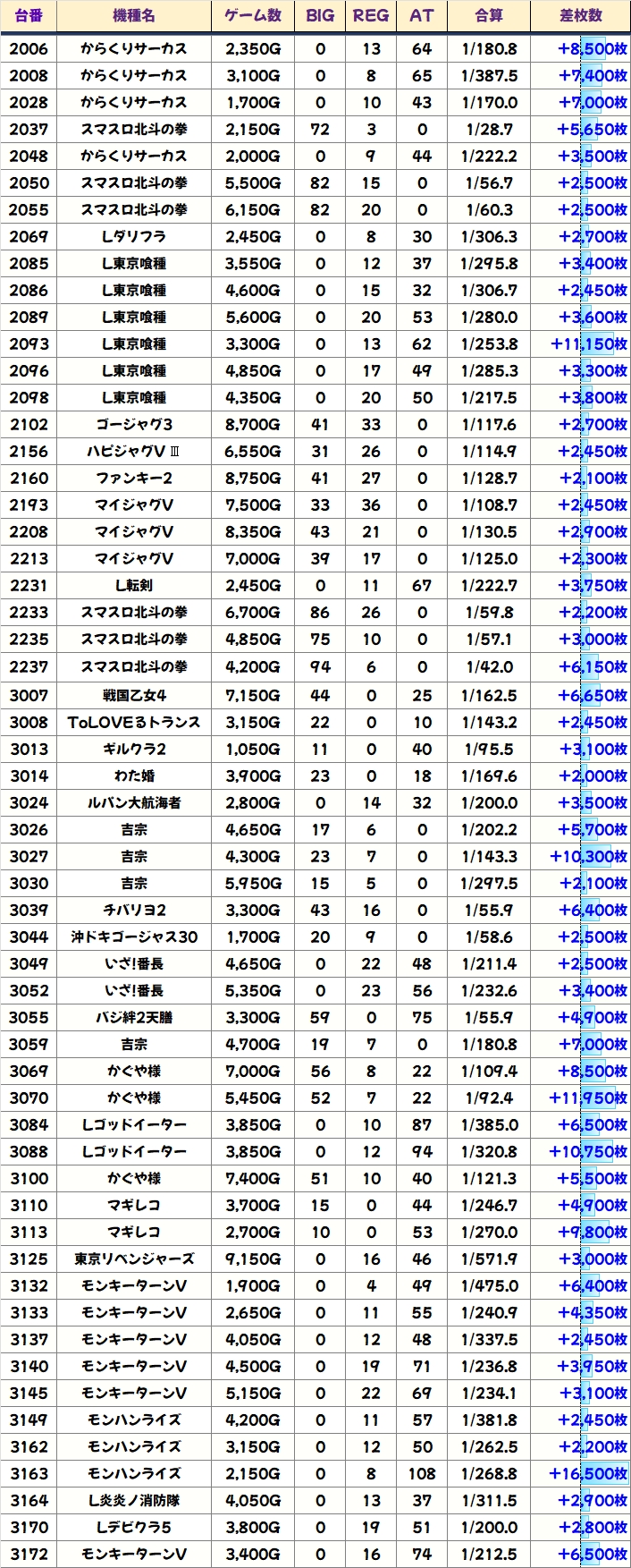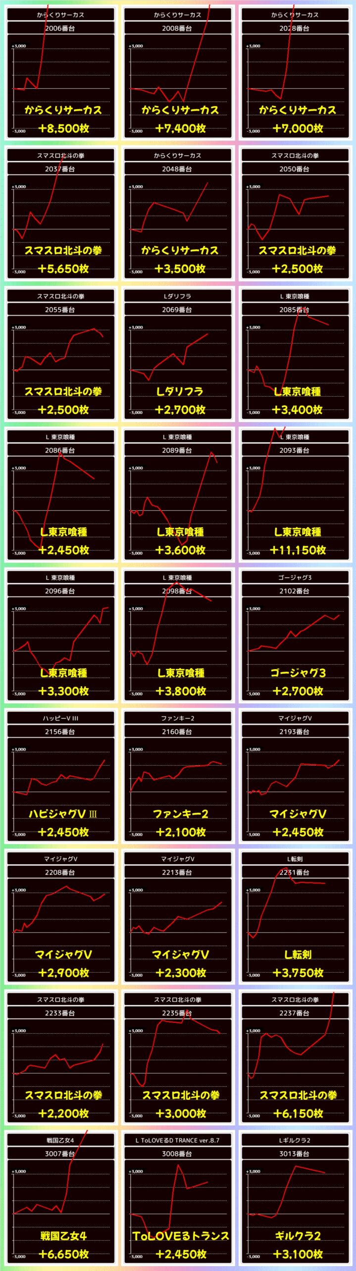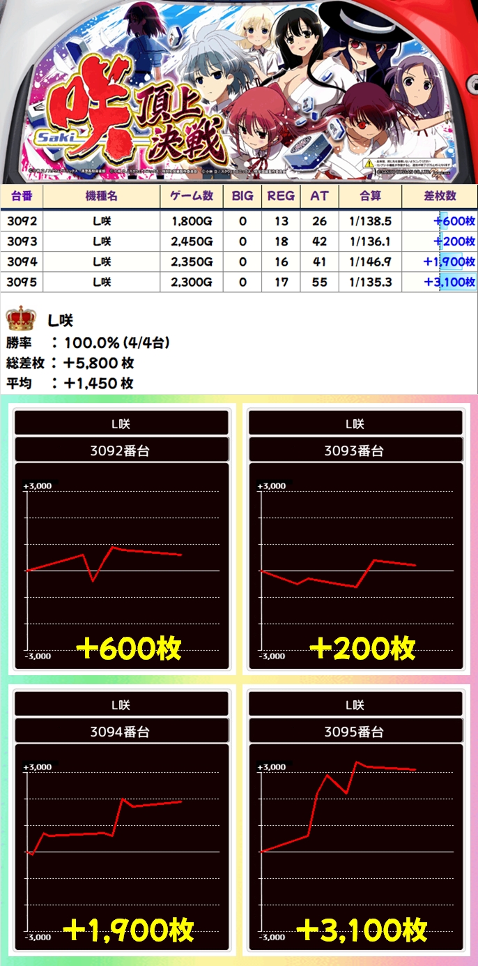 「咲」に関しては若干稼働不足となっていますが、全台プラスのところを見ると、仕掛けの対象だったと考えて間違いないのかなと。
