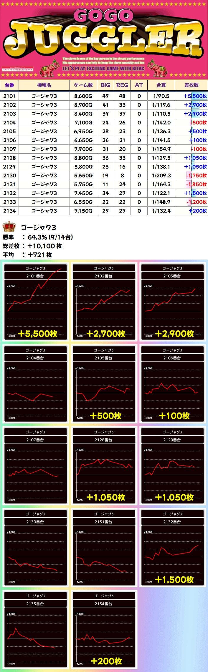 また、週間ポスターが登場していたジャグラーシリーズの中から「ゴージャグ」が仕掛けの対象になっていたようで、半分以上の台が優秀な結果を残していました!