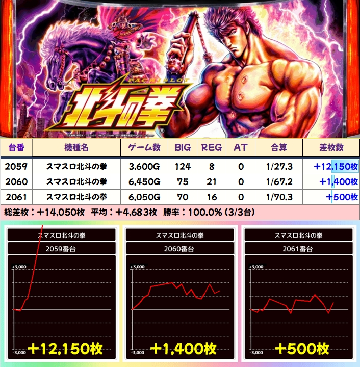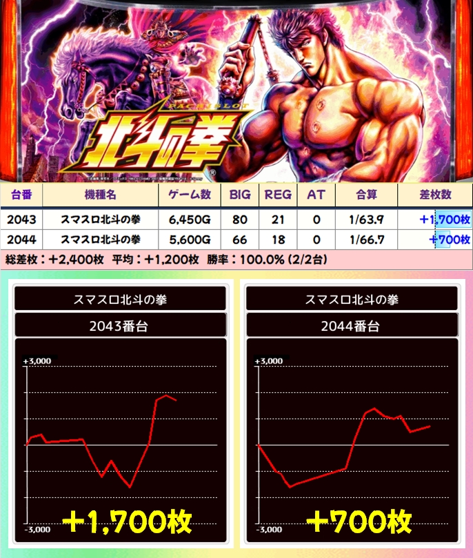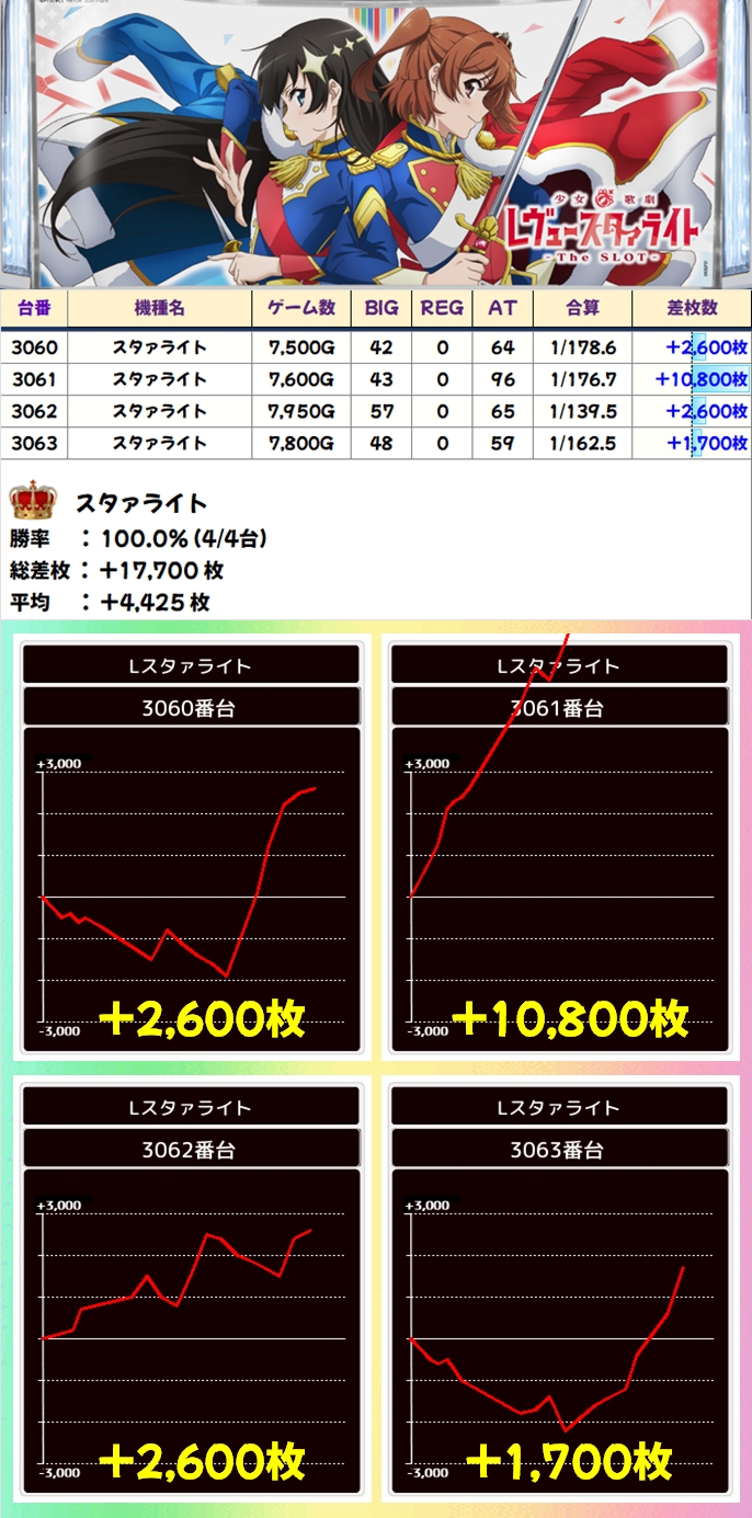 特に「レヴュースタァライト」は全台プラスかつ平均+4425枚と大幅プラスとなっており、万枚オーバー台も出現していましたよ!