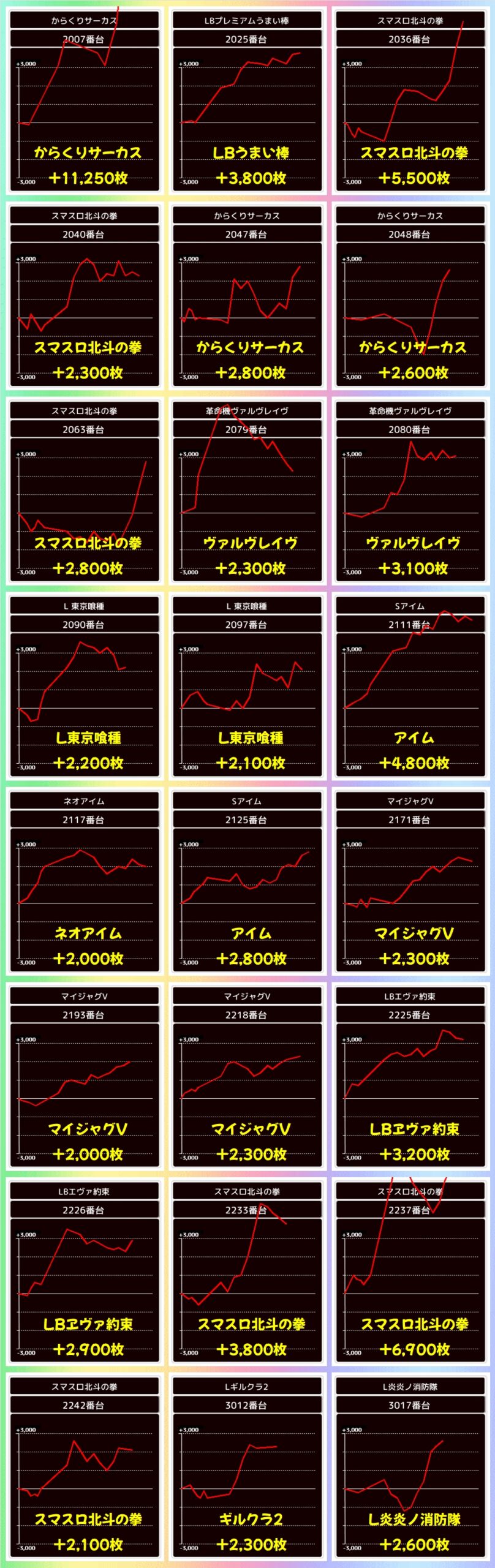 +5000枚オーバーの大量出玉も複数出現しており、「からくりサーカス」からは万枚オーバー台が出現していました!
