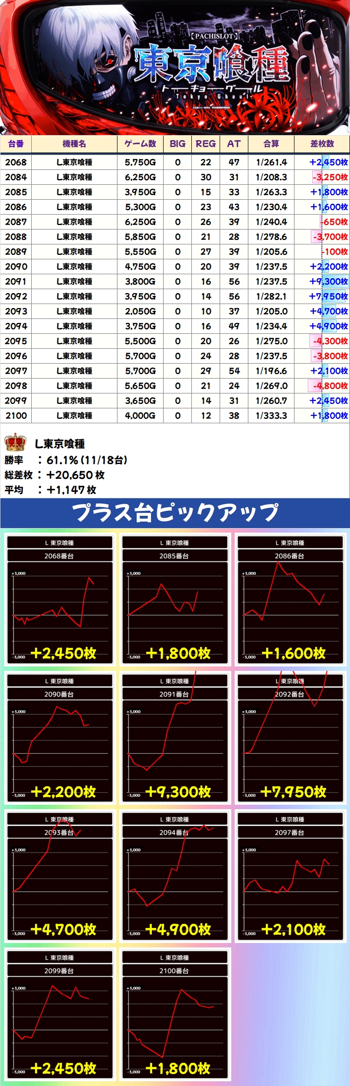 「東京喰種」からは5000枚オーバーの出玉も確認でき、+9000枚オーバーの万枚クラスの台も出現していましたよ!