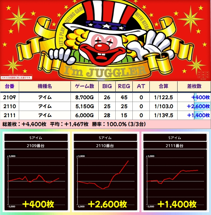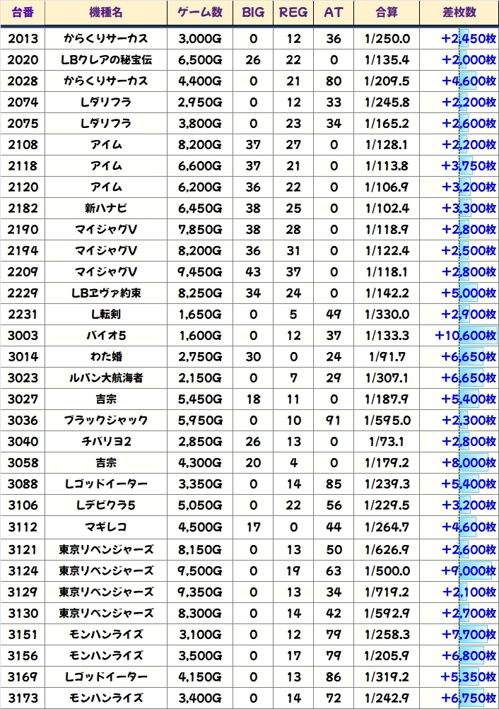 19台中16台がプラス差枚を記録しており、平均差枚も+2574枚と素晴らしい結果を残していたということで、仕掛けの質もかなり高かったのではないでしょうか?