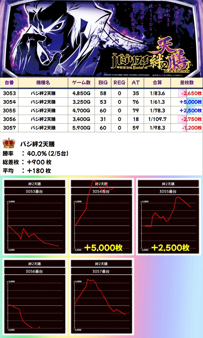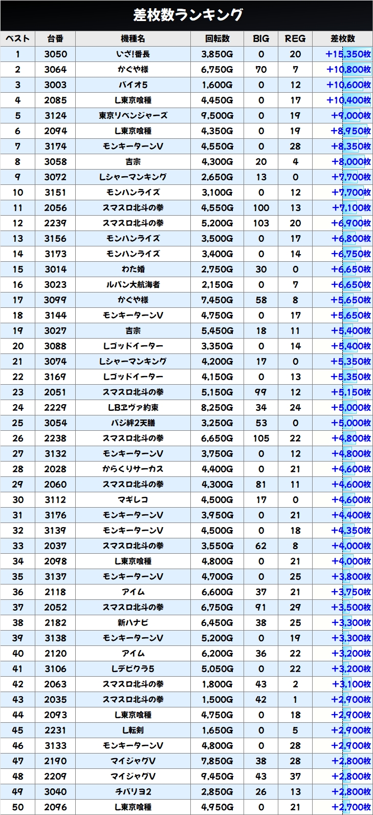 また、「いざ!番長」「バジ絆2天膳」「かぐや様」の3機種からは+5000枚以上の大量出玉を確認でき、「いざ!番長」と「かぐや様」からは万枚オーバーの爆出し台も出現していました!