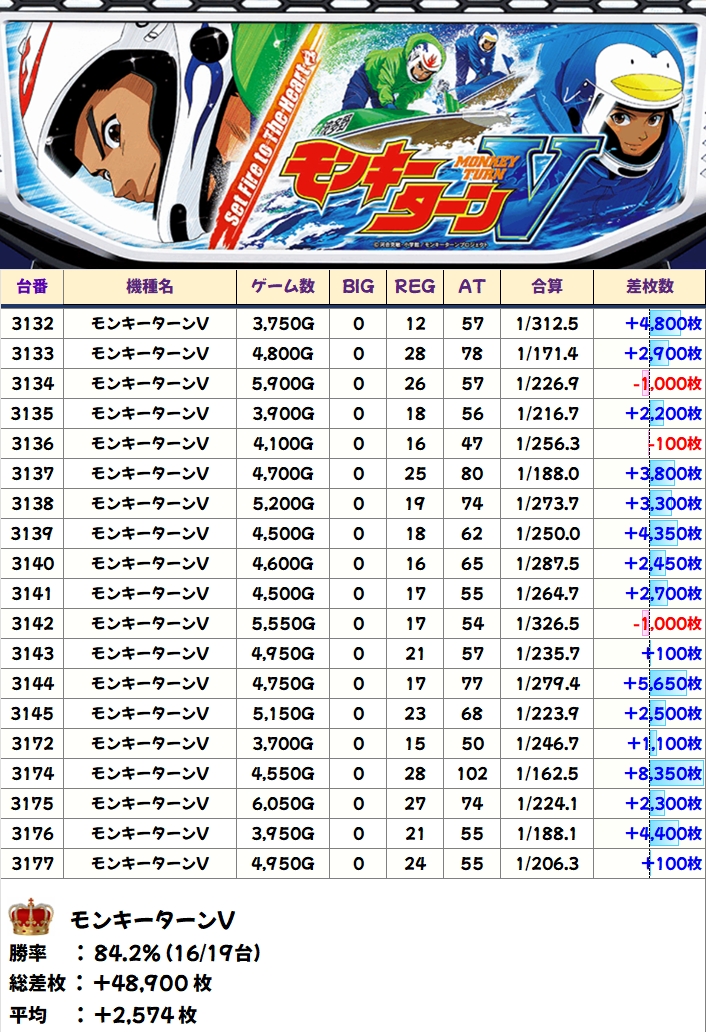 【全台系濃厚】モンキーターンV(16/19台+)→平均+2,574枚
