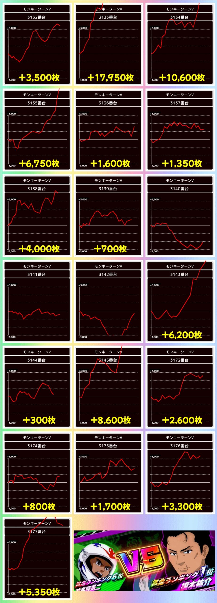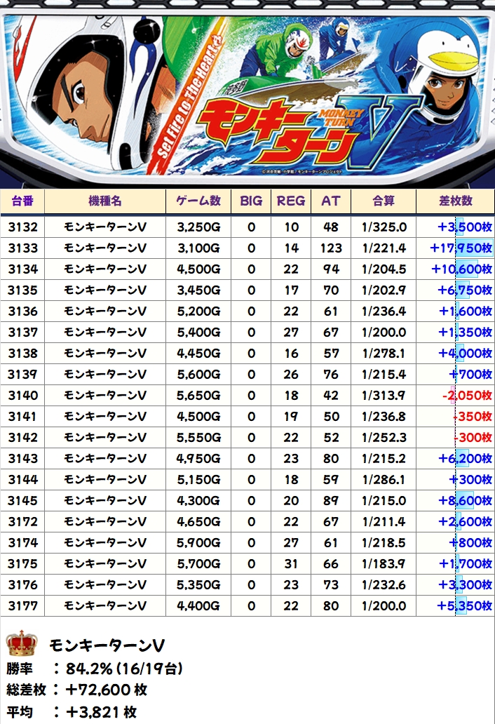 「モンキーターンV」は2日連続で全台系の対象になっていたようで、平均+3821枚、勝率84.2%(16/19台)と素晴らしい結果を残していました。この結果を見ると、仕掛けの質もかなり高かったように思えますね。