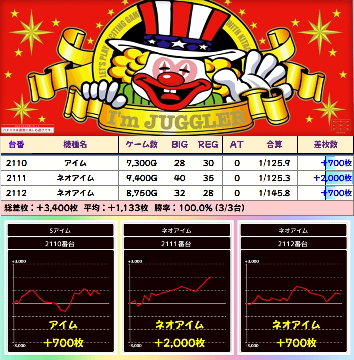 並び仕掛けは「マイジャグ」「アイム」「ネオアイム」から確認でき、「アイム」と「ネオアイム」は機種跨ぎでの並びとなっていました。