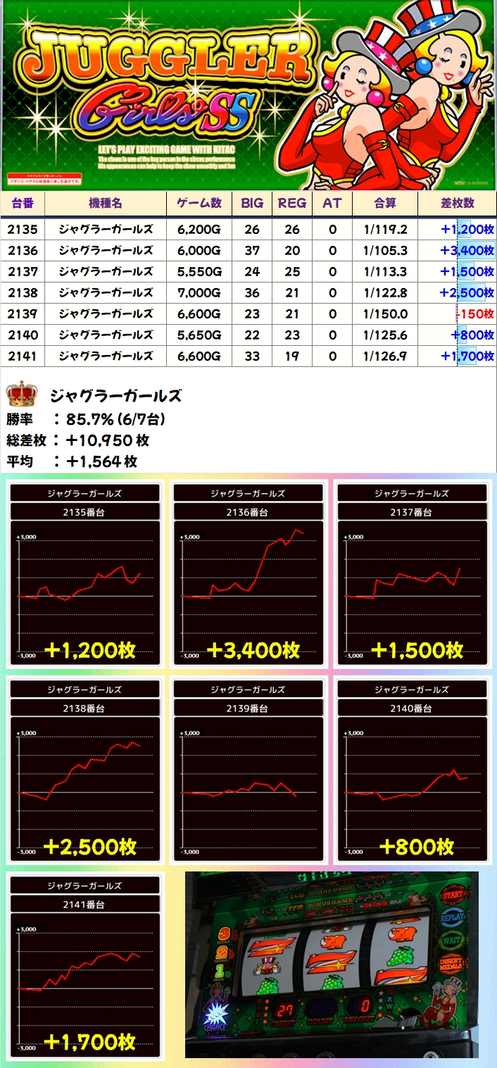 【全台系濃厚】ジャグラーガールズ(6/7台+)→平均+1,564枚