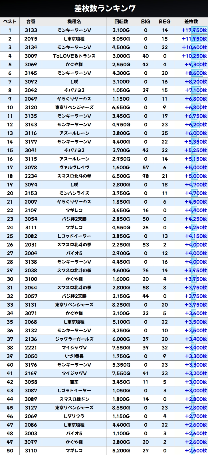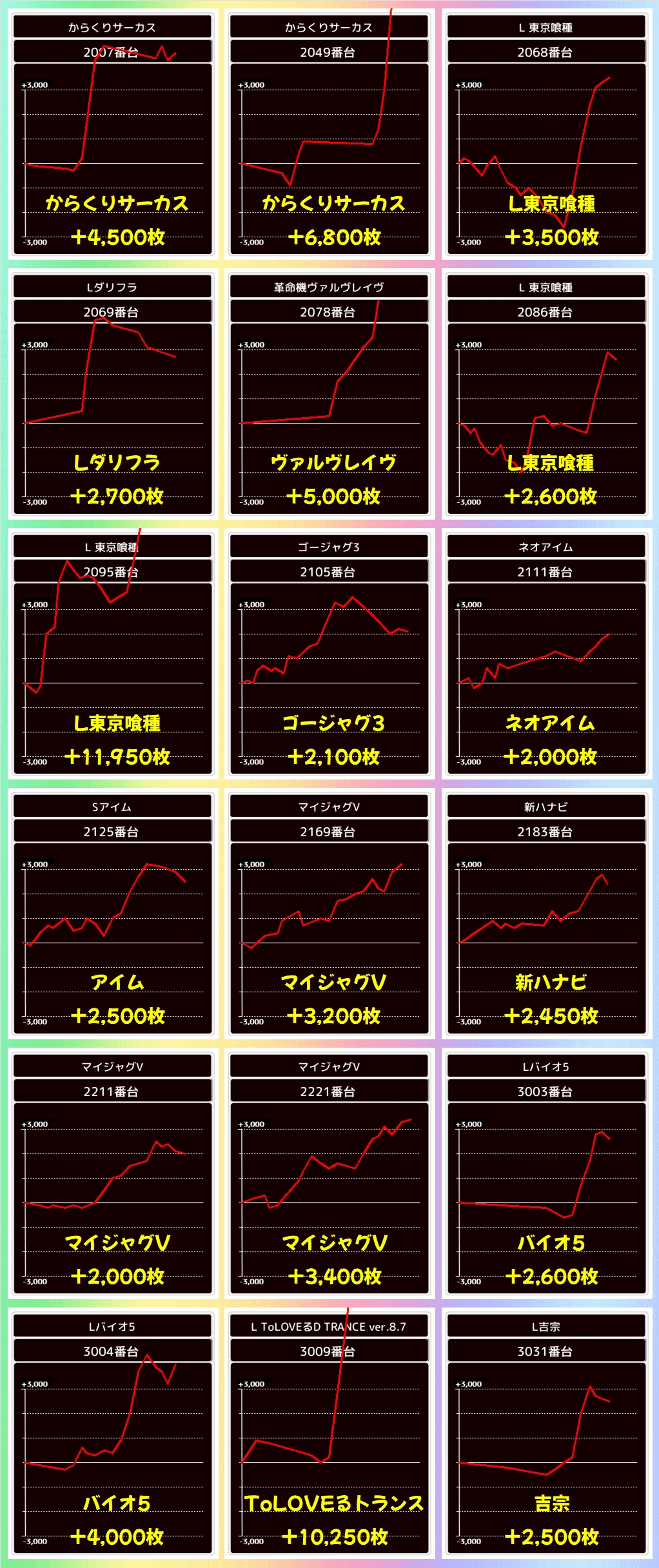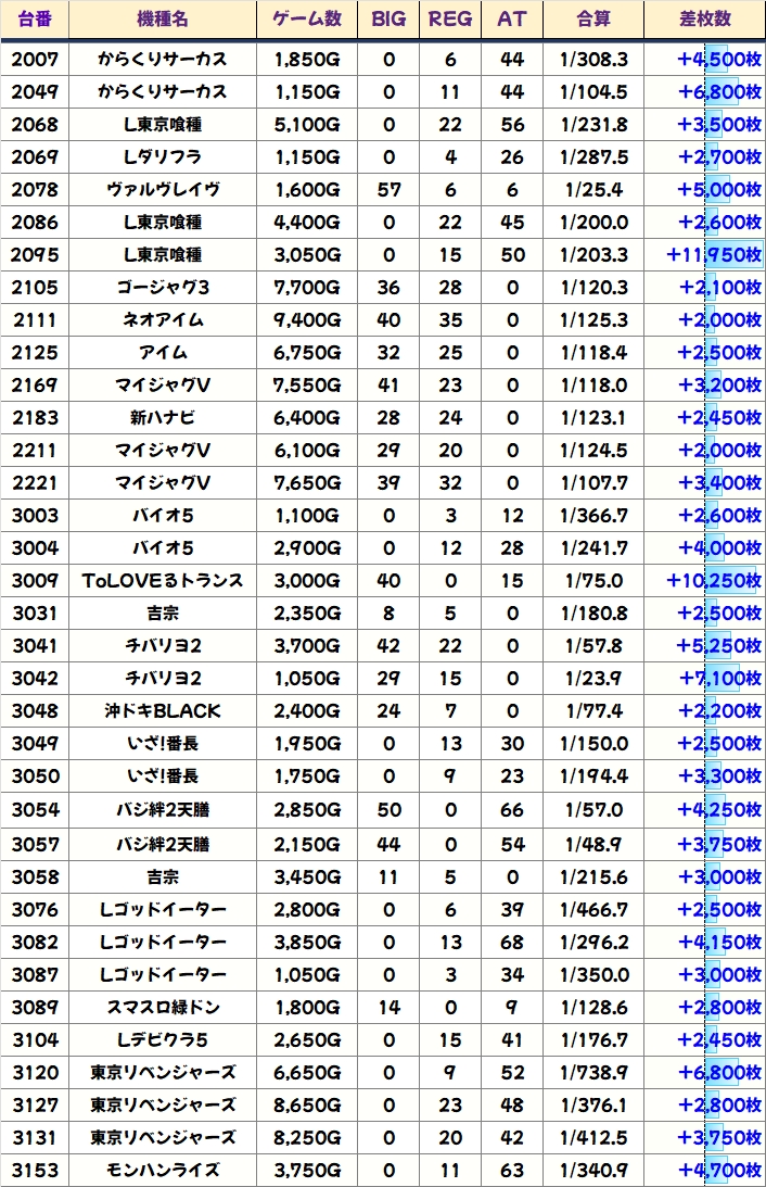 +3000枚以上の台が複数出現しており、+5000枚の爆出し台も確認することができました。