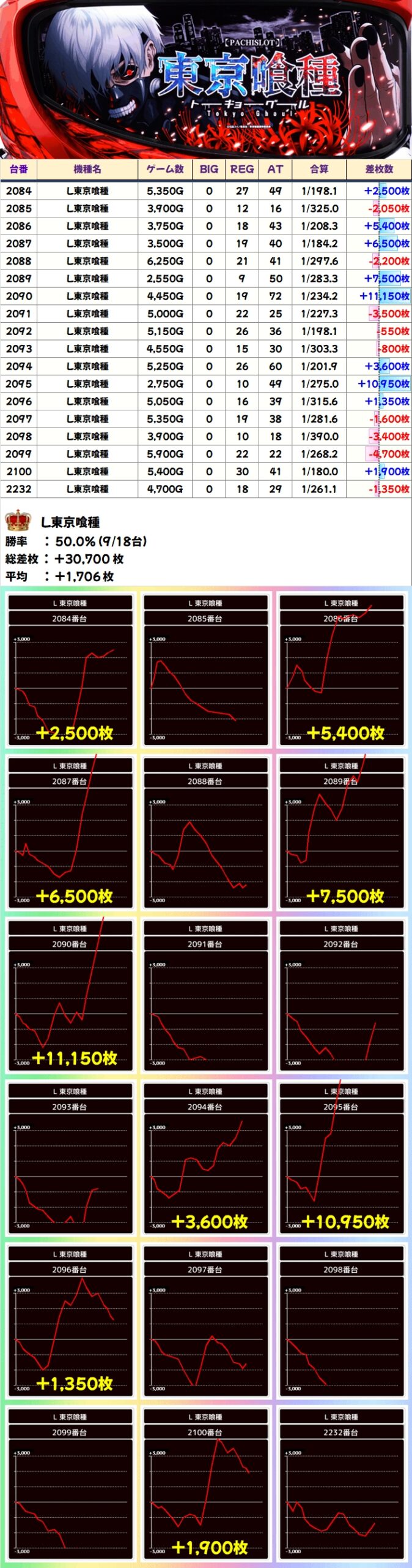 また、1/2系や高配分と思しき機種も多数確認でき、「東京喰種」からは万枚オーバー台が複数出現していました。