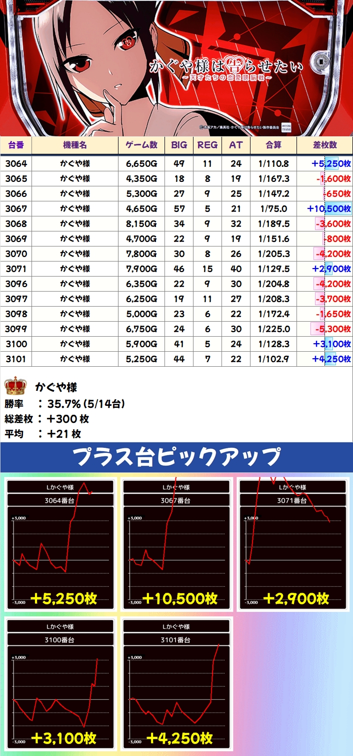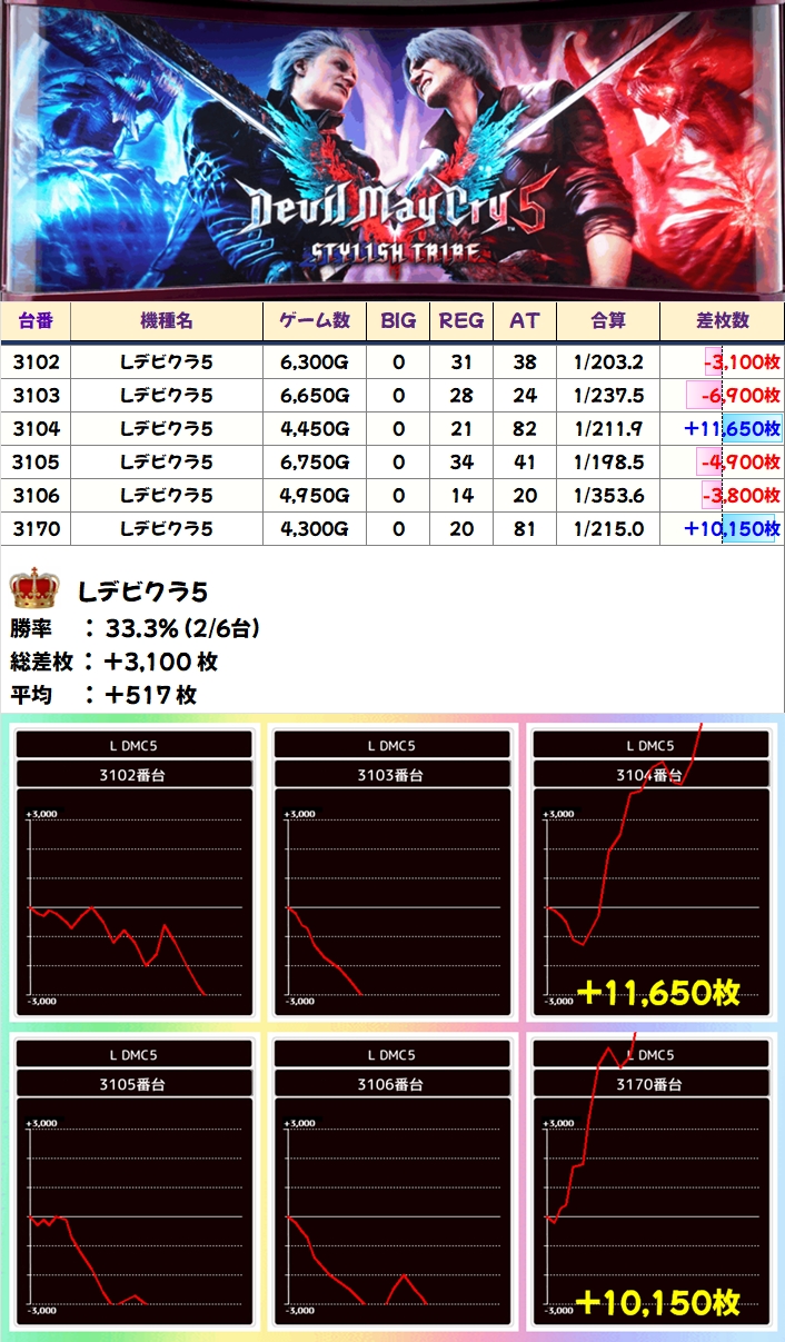 また、1/3系濃厚となった「デビルメイクライ5」と「かぐや様」からも大量出玉を確認でき、どちらからも万枚オーバー台が出現していました!