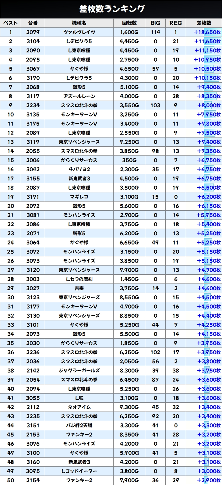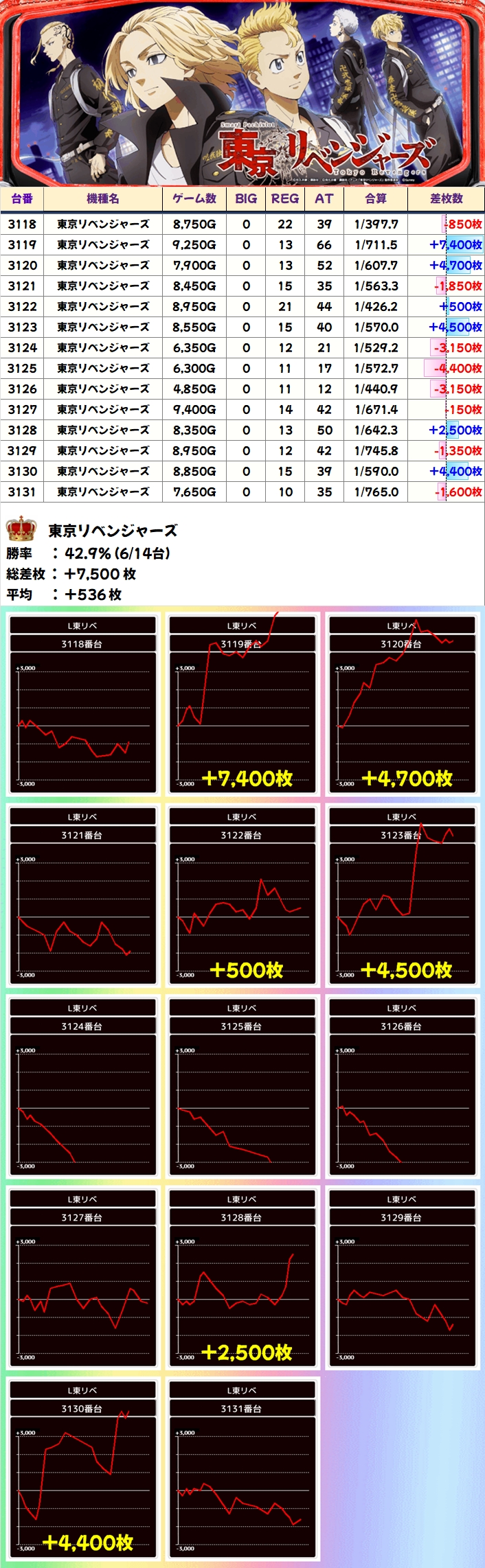 この日は渋谷ななこのポストでヒントがあった「東京リベンジャーズ」が仕掛けの対象になっており、+7000枚オーバーの爆出し台を筆頭に優秀台を複数確認!