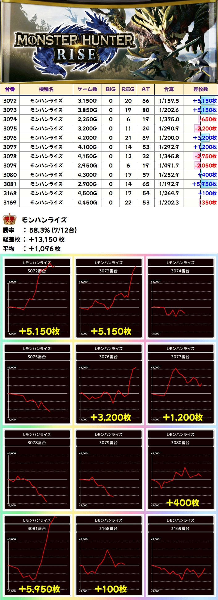【1/2系濃厚機種】モンハンライズ(7/12台+)→平均+1,096枚