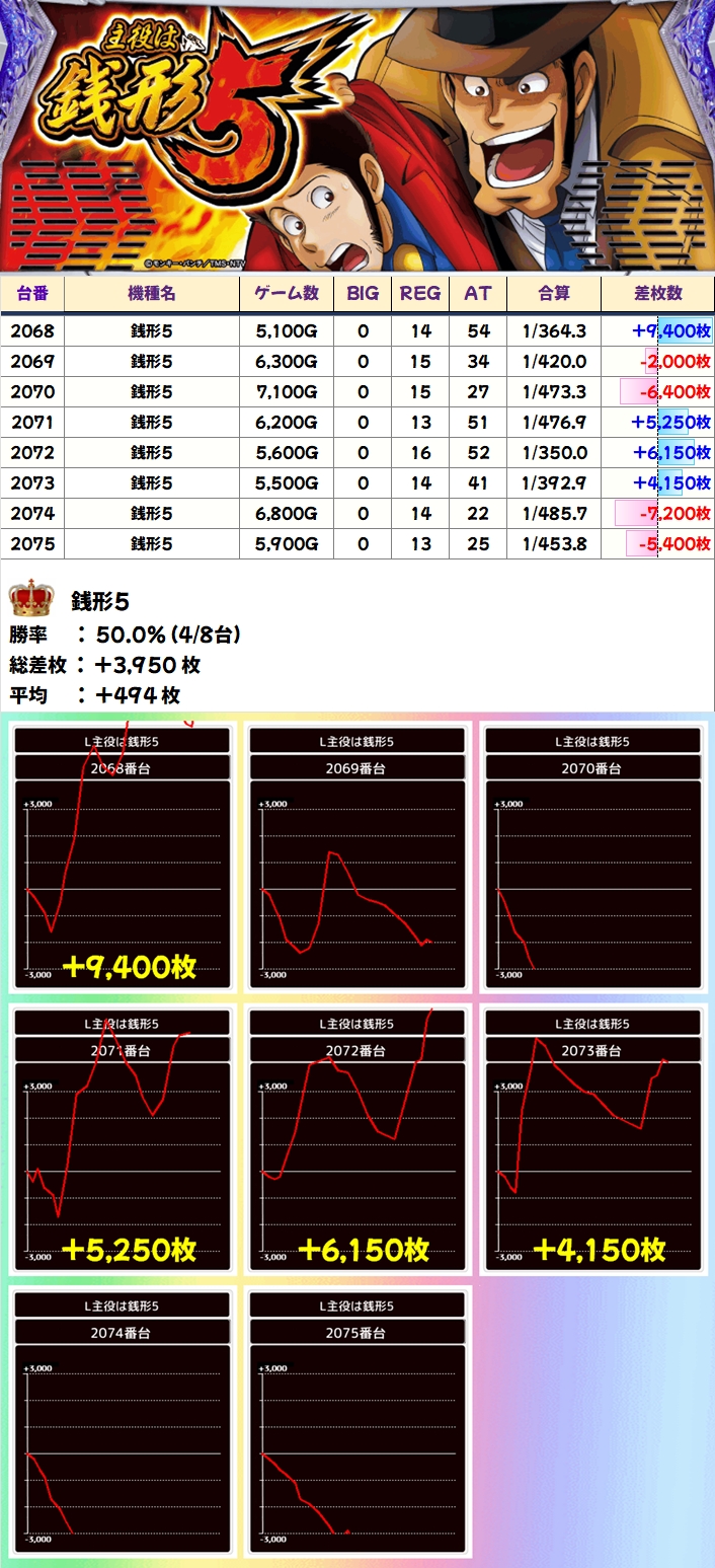 【1/2系濃厚機種】銭形5(4/8台+)→平均+494枚