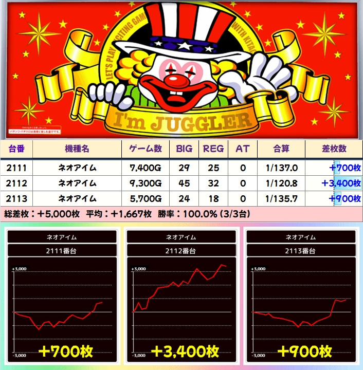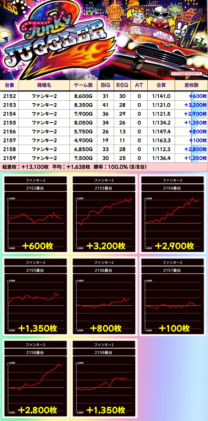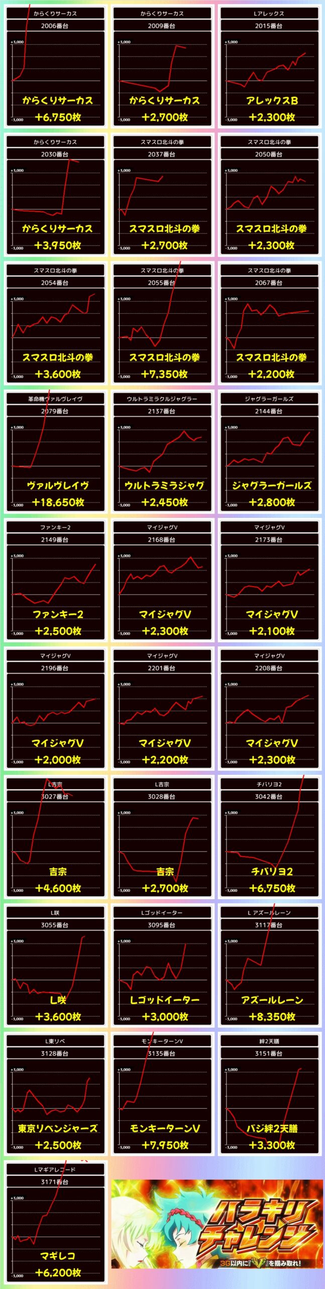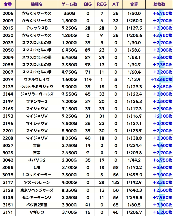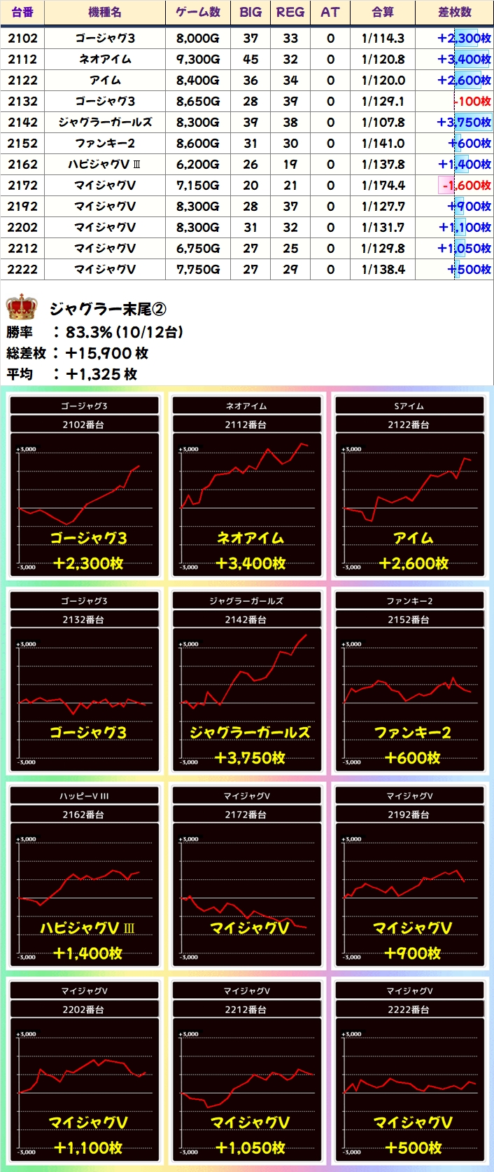 今回のぶどうの仕掛け=全台系は3台設置の「ミスジャグ」が対象になっていたようで、3台ともしっかりプラス差枚を記録していました。