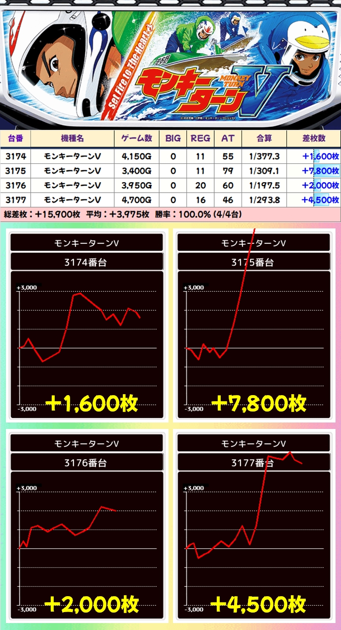 今回はメイン機種の「北斗」と「モンキーターンV」に塊での投入を確認でき、「モンキーターンV」は列仕掛けになっていた模様!