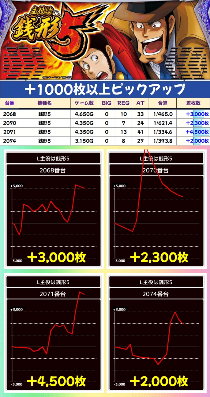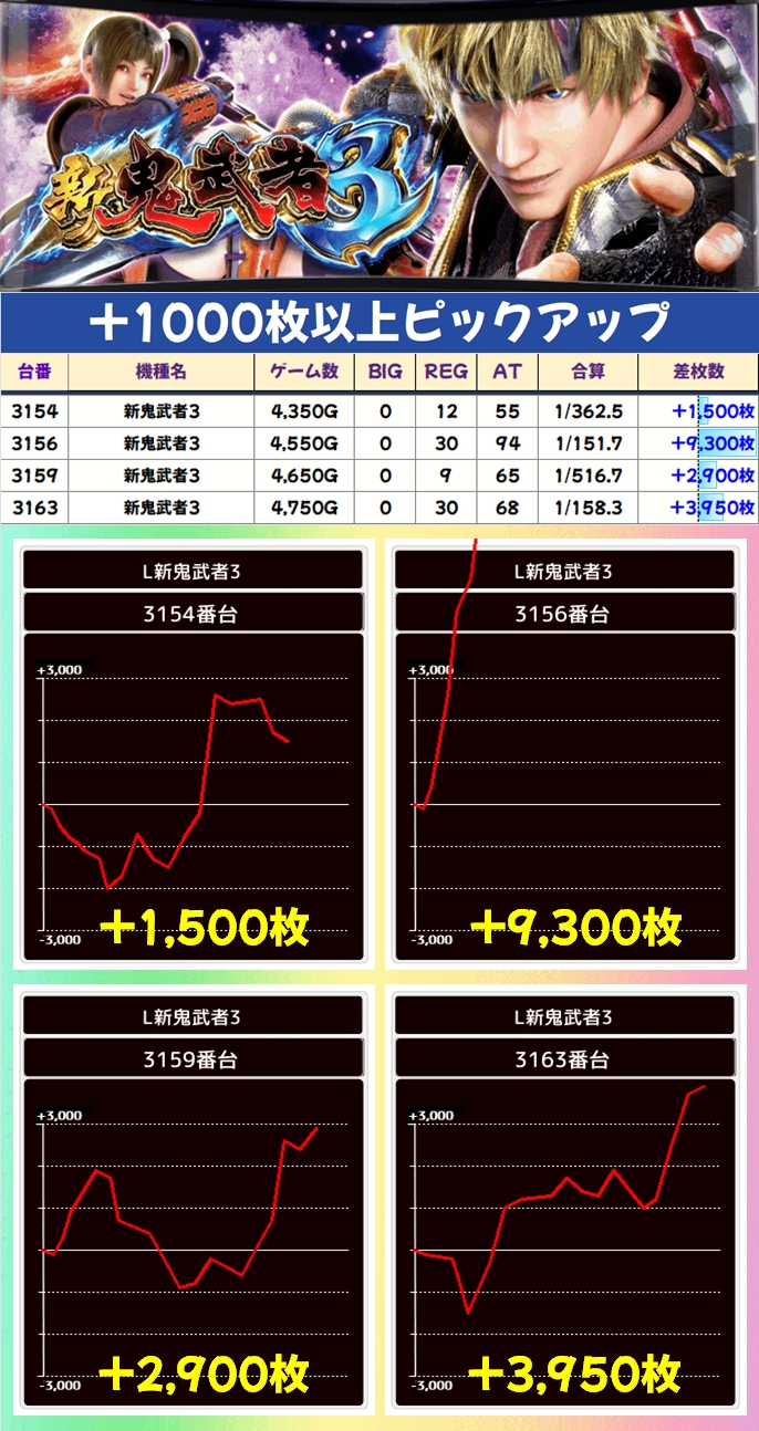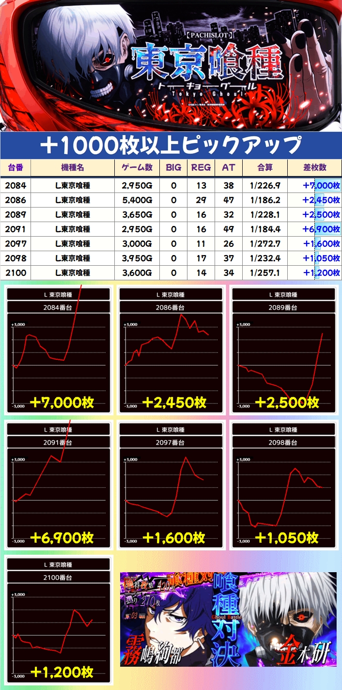 上記の機種からも大量出玉が飛び出しており、「東京喰種」と「新鬼武者3」からは+5000枚以上の爆出し台を複数確認することができましたよ!
