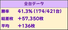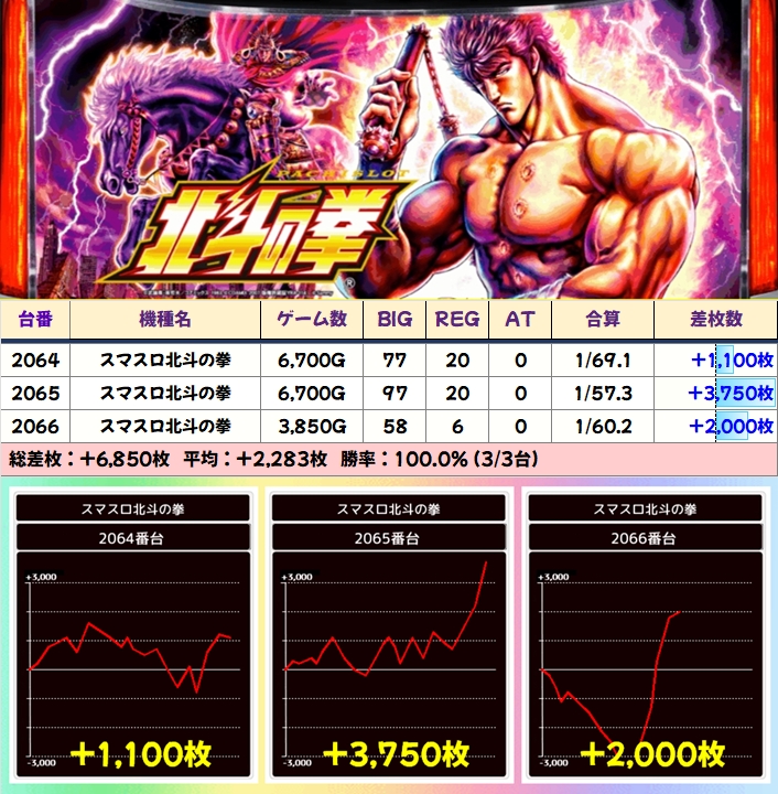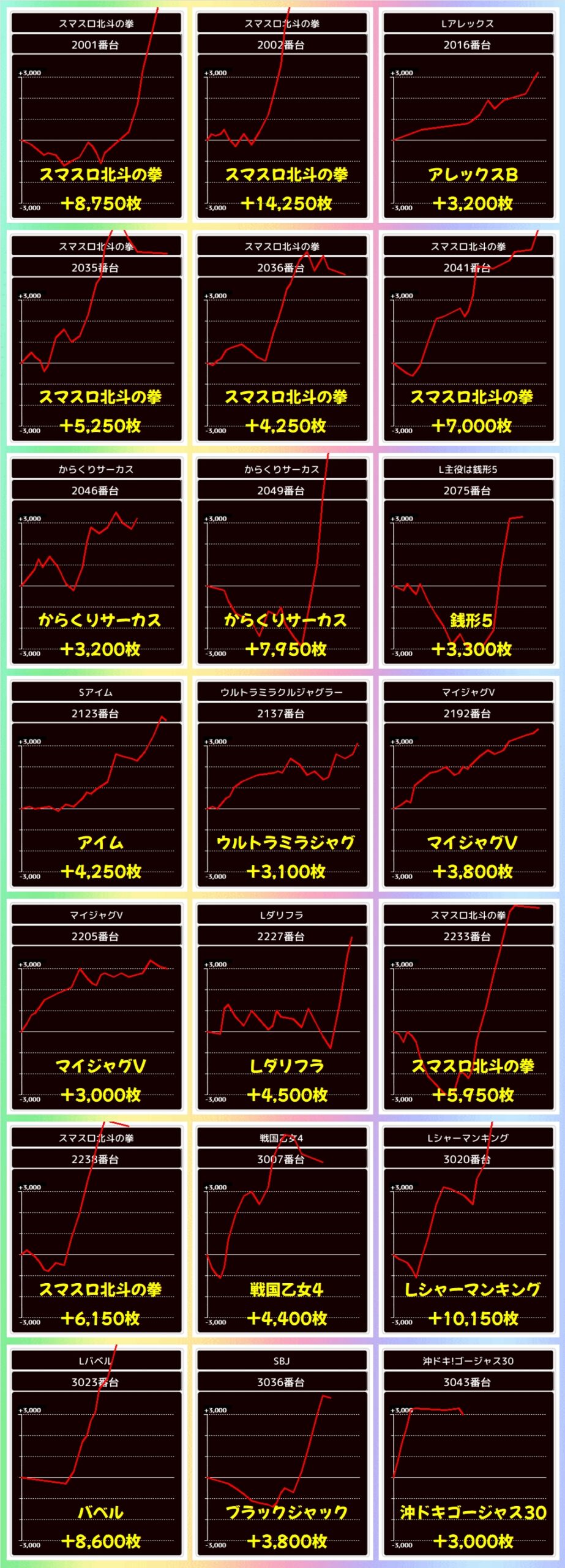 そんな、注目ポイントが複数ある今回の初撃コラボでしたが、例に漏れずお宝台が多数用意されていたようで、ホール全体でしっかりプラス差枚を記録!