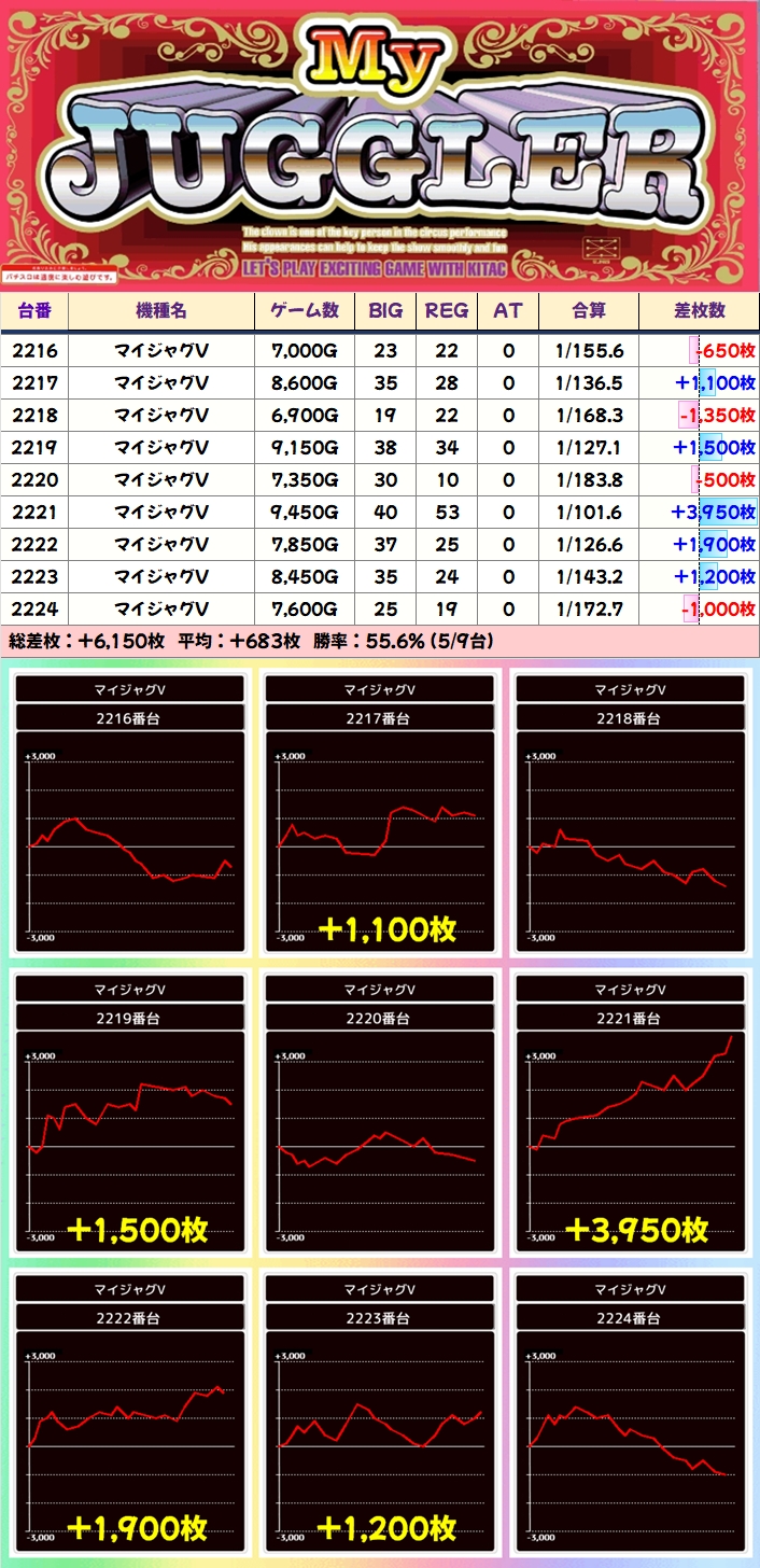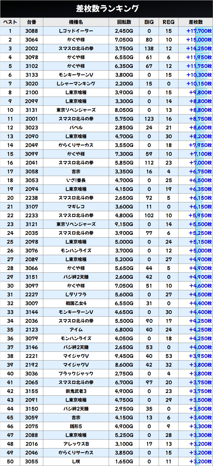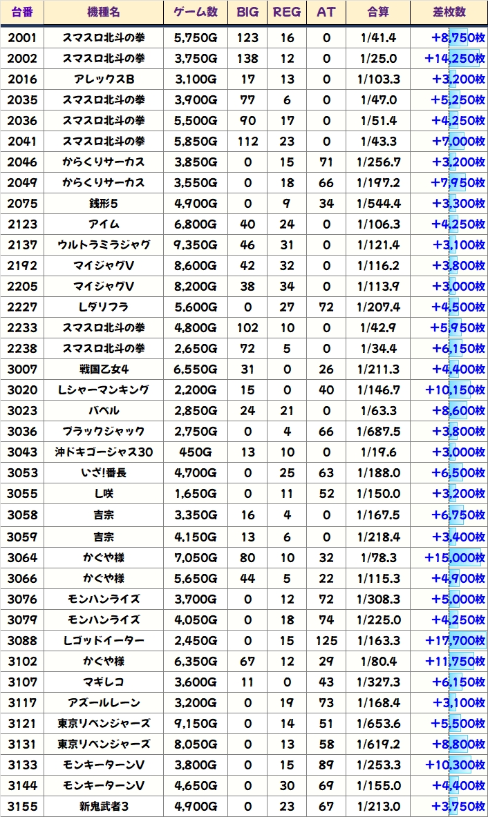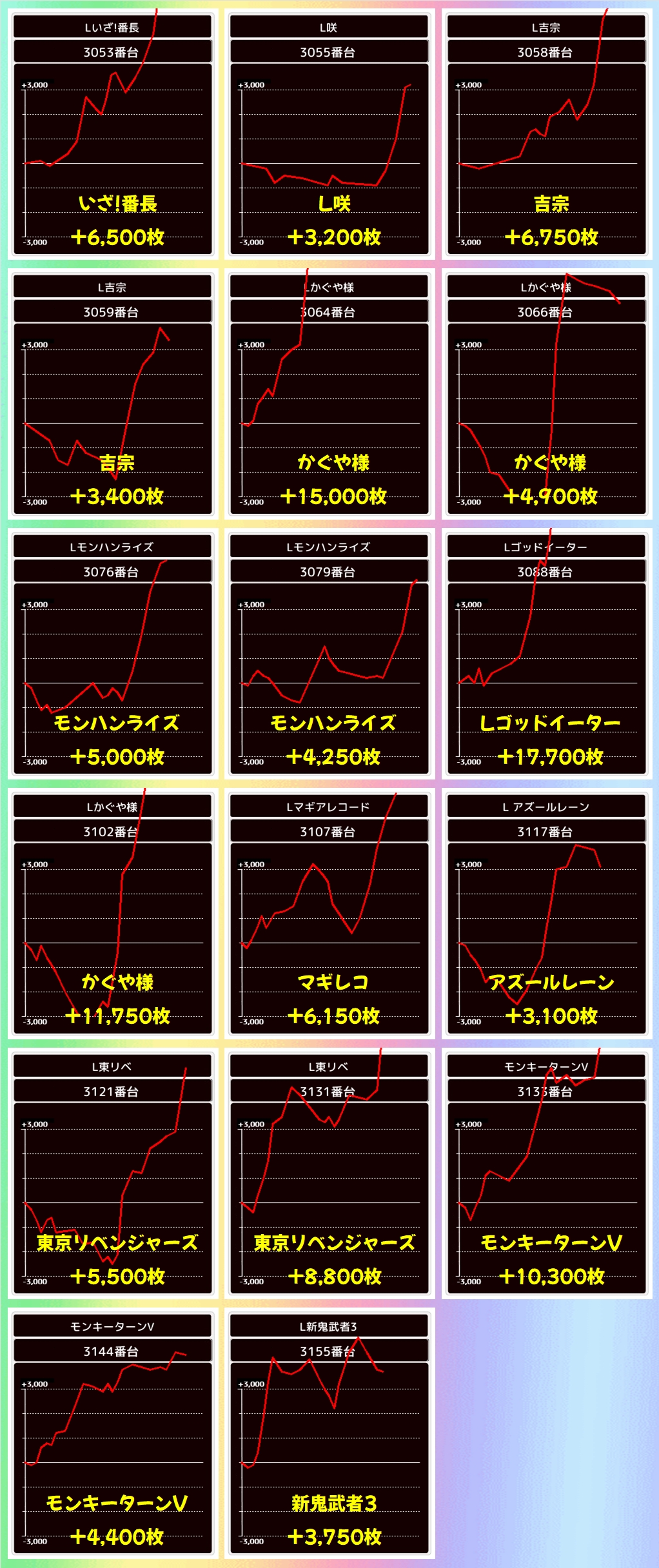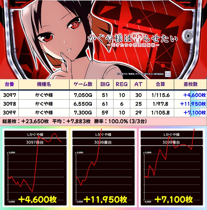 かぐや様の並びはお祭り騒ぎとなっており、1台が万枚を記録したことで平均+7883枚と超爆出しとなっていました。