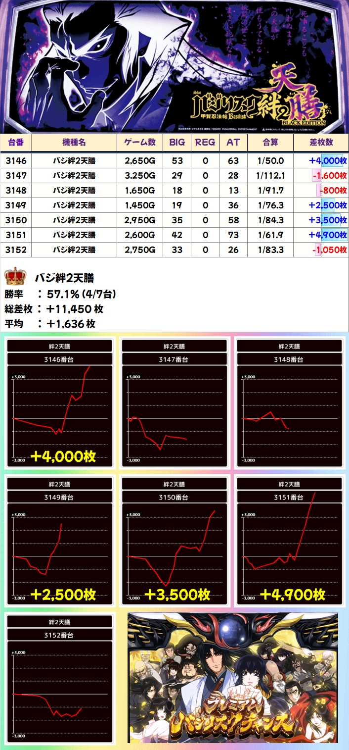 この日は東京喰種以外にも全台系が用意されていたようで、バジ絆2天膳が平均+1600枚超と好結果に!