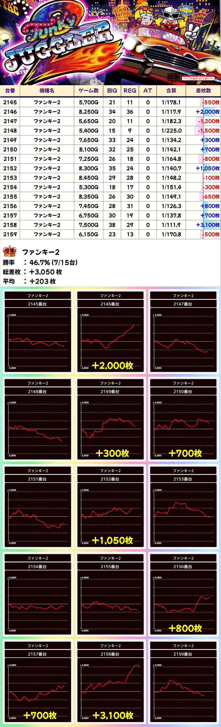 【1/2系濃厚】ファンキー2(7/15台+)→平均+203枚