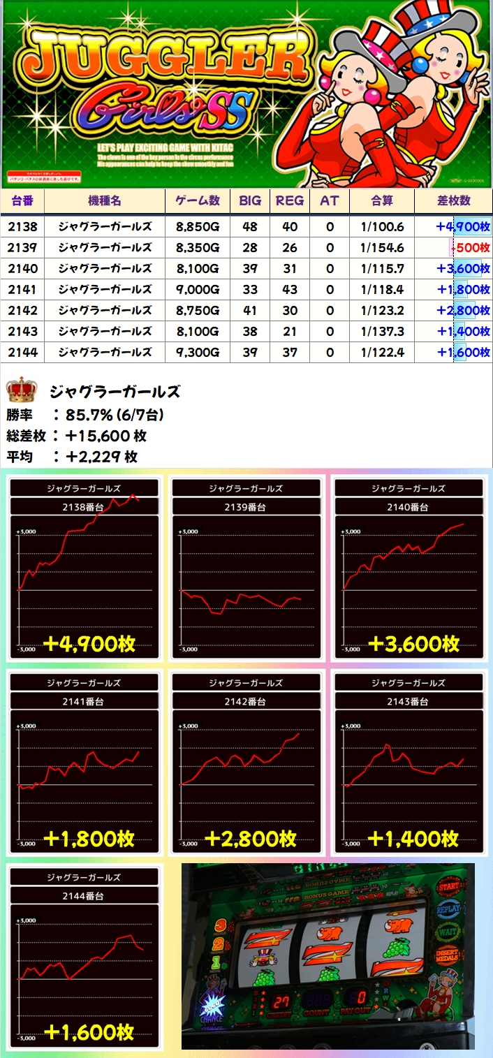 【全台系濃厚】ジャグラーガールズ(6/7台+)→平均+2,229枚