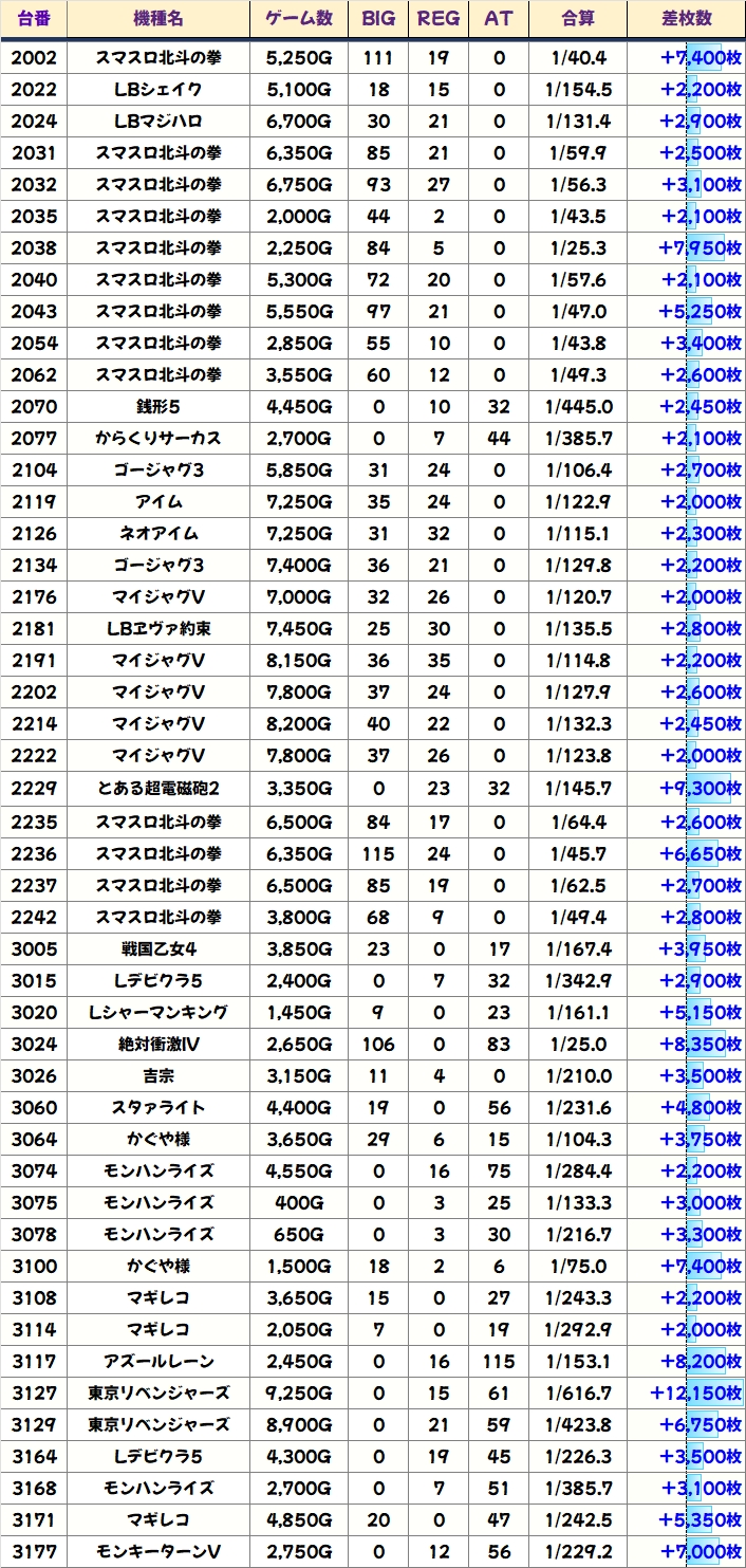 そんな月イチ周年日でしたが、今回も多数のお宝台が用意されていたようで、ホール全体で大幅プラスを記録!