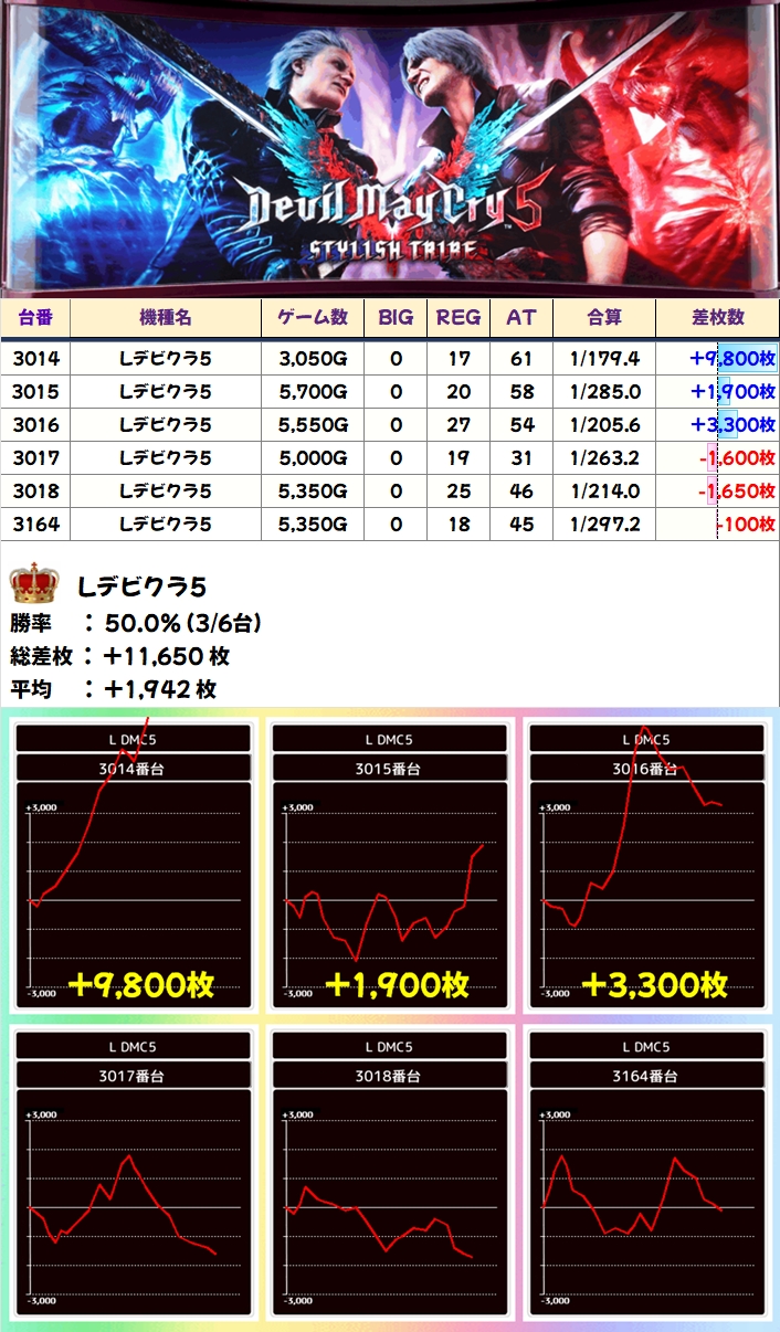 デビルメイクライ5からは大量出玉も飛び出しており、3014番台が+9800枚と万枚クラスの出玉を叩き出していました!