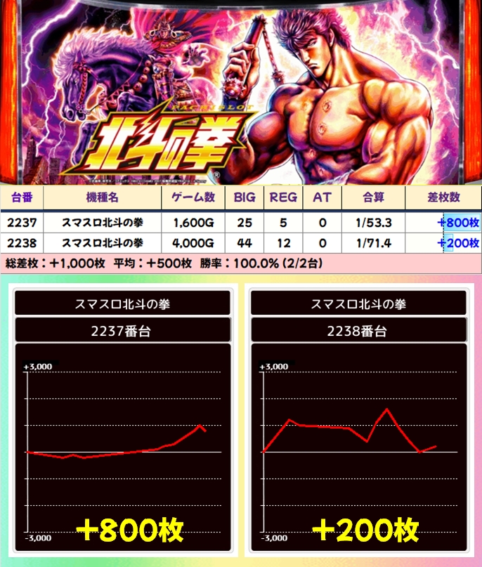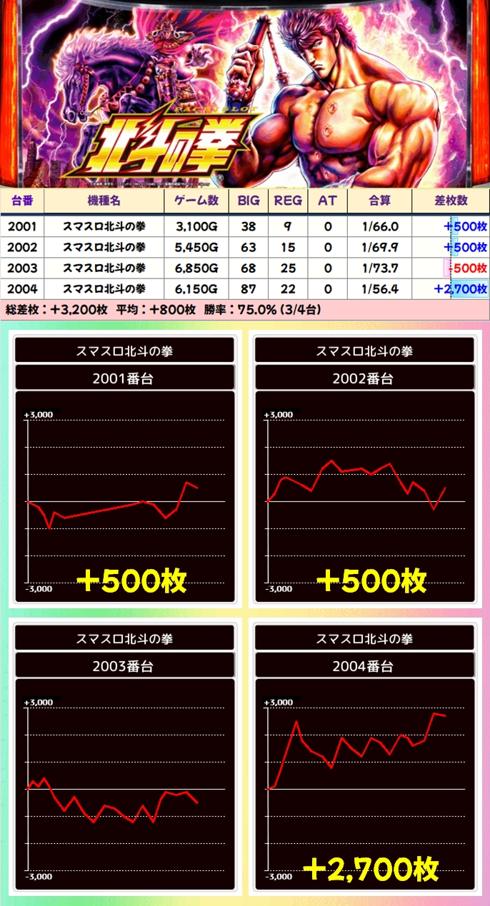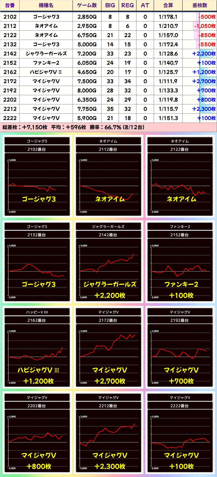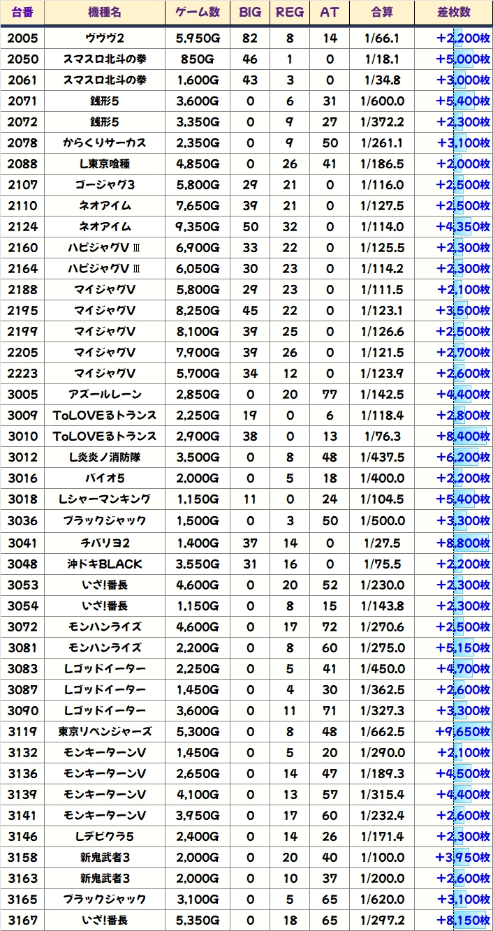 そんな、毎月1日の近隣対抗日でしたが、今回もお宝台が多数投入されていたようで、ホール全体でしっかりプラス差枚を記録!